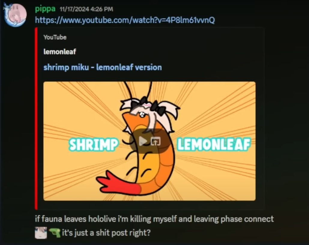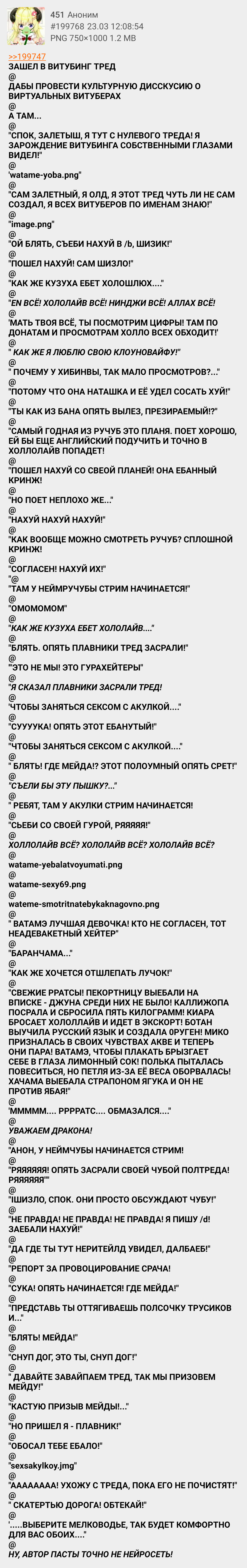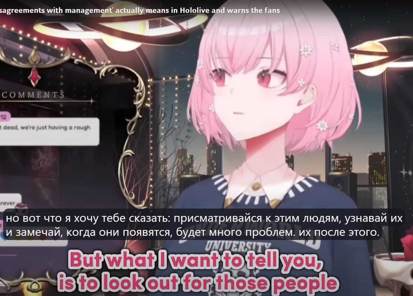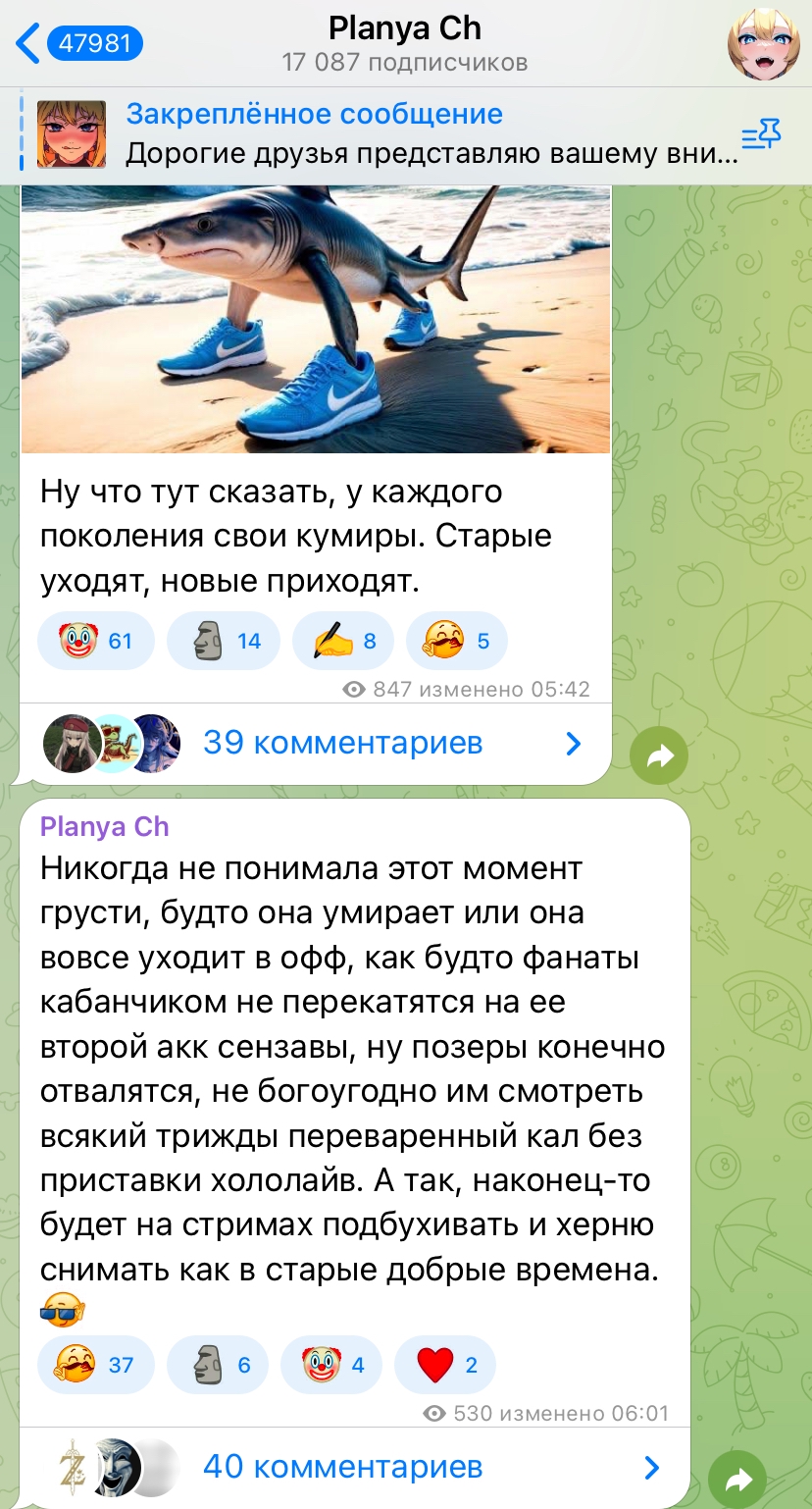 > Я супер-устал за вчерашний день. Хотел постримить, но физически уже не смог потому что в чатах в Дискорде и Телеге происходил анал-карнавал и мы с модерами пытались это дело хоть как-то просматривать и поддерживать порядок, я не спал с пяти утра потому что именно ночью и утром была самая жесть. Еще никогда чаты настолько не полыхали лол. Но я никого не виню, само собой. Оно и понятно, уход Гуры это очень большое событие и людям нужно было выпустить свою фрустрацию. Надеюсь что хотя бы некоторым из вас разговоры помогли обрести душевное равновесие. Я только хочу сказать что мои мысли с выхода ролика не изменились. "Разногласия с менеджментом" это ОЧЕНЬ-ОЧЕНЬ-ОЧЕНЬ гибкая формулировка. Это не одна какая-то причина, это множество индивидуальных вещей, о которых девчонки, ввиду самой природы витубинга, рассказать не могут. Опять-таки, уход Гуры сюрпризом ни для кого не был. Уход Мумей не удивил тех кто долго за ней следил. Уход Шион тоже не сюрприз. У девчонок довольно индивидуальные случаи и, зачастую, личные причины. Вот вам женщина-краб в подтверждение: https://www.youtube.com/watch?v=pIrSHtHnRE0