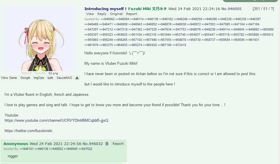 >>456325 Спешите видеть, ещё один "фанат" вылез который даже хирагану скорее всего не знает, а весь калтент по пекоре который он потребляет это раковые нарезки с соевого реддита.