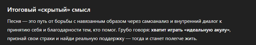 >>456403 Ты какой то долбаеб, воспринимающий слова нейронки как истину, и логика у тебя, блять, по типу: критика образа была? Была. Образа акулы? Акулы. Значит, что ей не нравится ее образ акулы. А что песня в первую очередь про то, что она сама для себя самый строгий судья и критик, ты игнорируешь