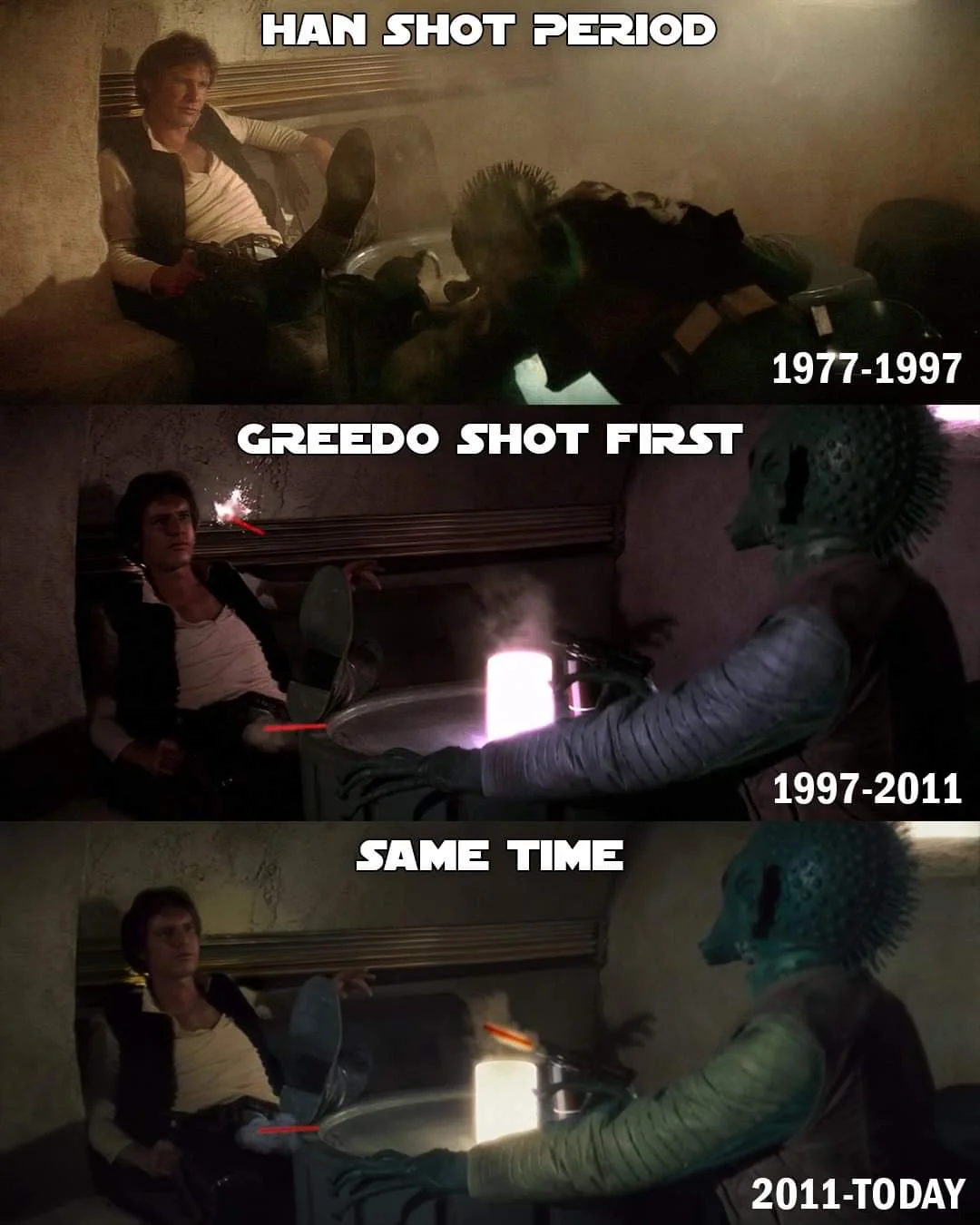 >>459408 Все помнят, барбара стрейзенд, Лукас хотел сделать Хана не таким однозначным и в переиздании в нулевых навалил кринжового графония, якобы гридо вынудил Хана себя убить, но мы то знаем, что Хан Стрелял первым.(как я в постели с девушками, что ещё больше позволяет себя с ним асоцировать)