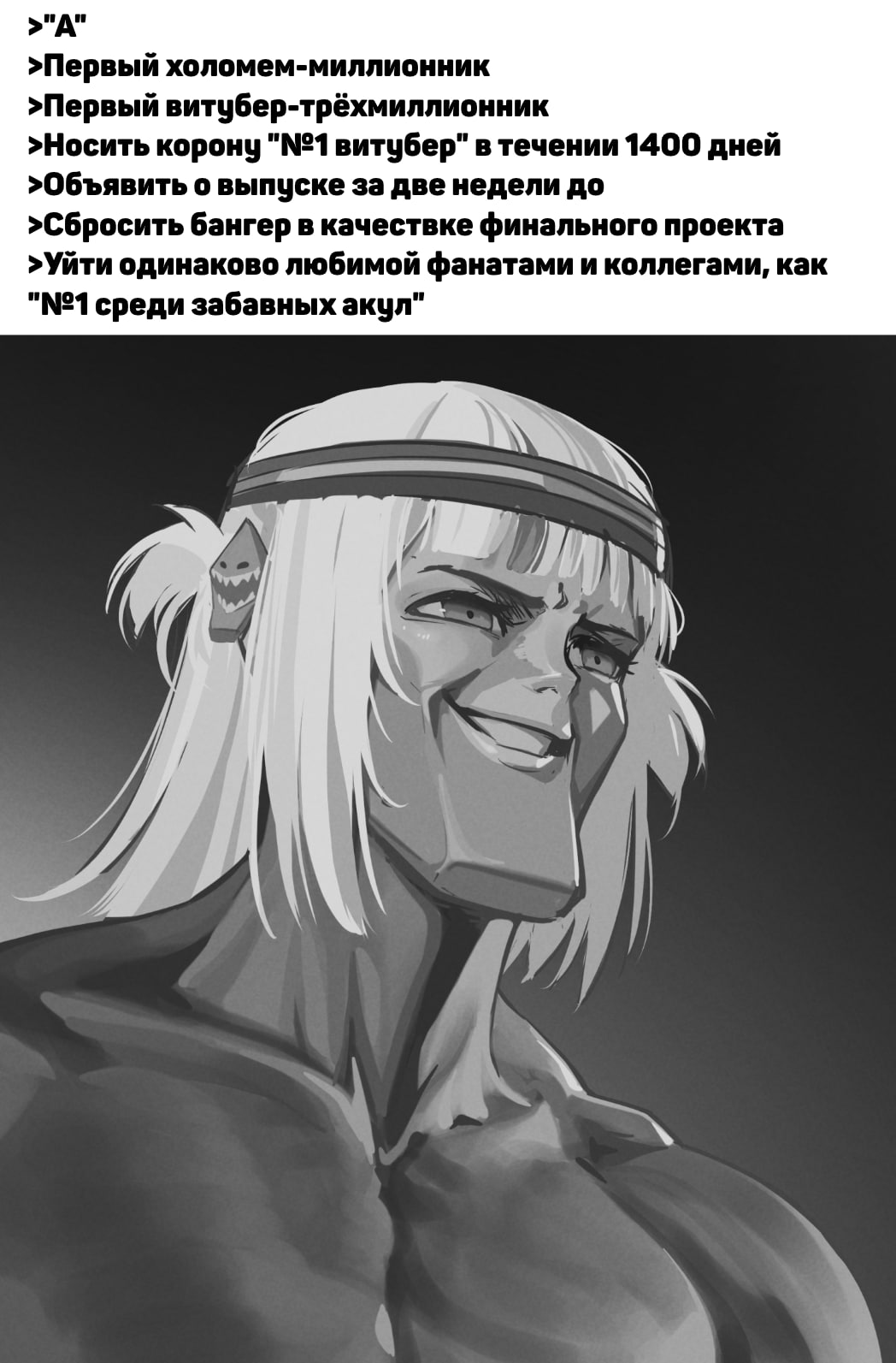 >>459990 >Как я понял из содержания + контекста, это должен был быть лучший нот-лайв перформанс Холо Нет? Ну серьёзно, с какого хуя ты это взял? Акула попросила коллаб с известными людьми, уверенная что ей откажут, ей разрешили, композитор поспрашивал какие эмоции она хочет в песню вложить, она рассказала, он текст написал и музыку сделал, под это другой известный чел клип нарисовал. На каком этапе кто-то из них внезапно должен был решить, что это самая важная работа в холо и надо прям разъебать все чарты, расскажи-ка подробнее? Они там вообще такими категориями не мыслят, ты слишком долго с двачерами в одном помещении просидел и у тебя соображалка не с той стороны сгнила. >>459993 Это тоже, кстати. Песня должна была быть несколько "личной", нравящейся не всем, но придерживающейся определённой планки и западающей в душу некоторым из фанатов — так она таковой и является. С поставленными задачами все справились отлично, просто кое-кто эти задачи даже близко понять не смог.