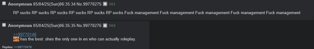 >>460666 Чому? Типичная же пиздючка-злодейка, будет отвечать за петросянщину и кринжатину. Самое забавное, что камушек попробовал хоть как-то обыграть твист в конце MAY THE LANDS BURN, бавы "драматично" и молча оффнулись, а вот две самых пафосных особы из состава...Шиори выдавила из себя "Лол! Пока!" и отключилась, а Нериска просто сломала атмосферу момента, решив попиздеть с чатом в духе ВАУ, ЭТО БЫЛО ВЕСЕЛО.