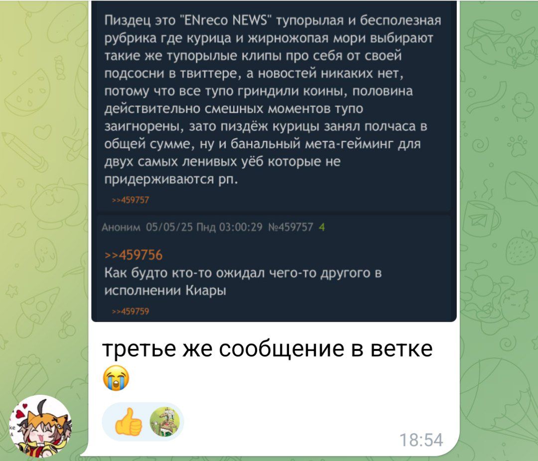 Пиздец это "ENreco NEWS" тупорылая и бесполезная рубрика где курица и жирножопая мори выбирают такие же тупорылые клипы про себя от своей подсосни в твиттере, а новостей никаких нет, потому что все тупо гриндили коины, половина действительно смешных моментов тупо заигнорены, зато пиздёж курицы занял полчаса в общей сумме, ну и банальный мета-гейминг для двух самых ленивых уёб которые не придерживаются рп.