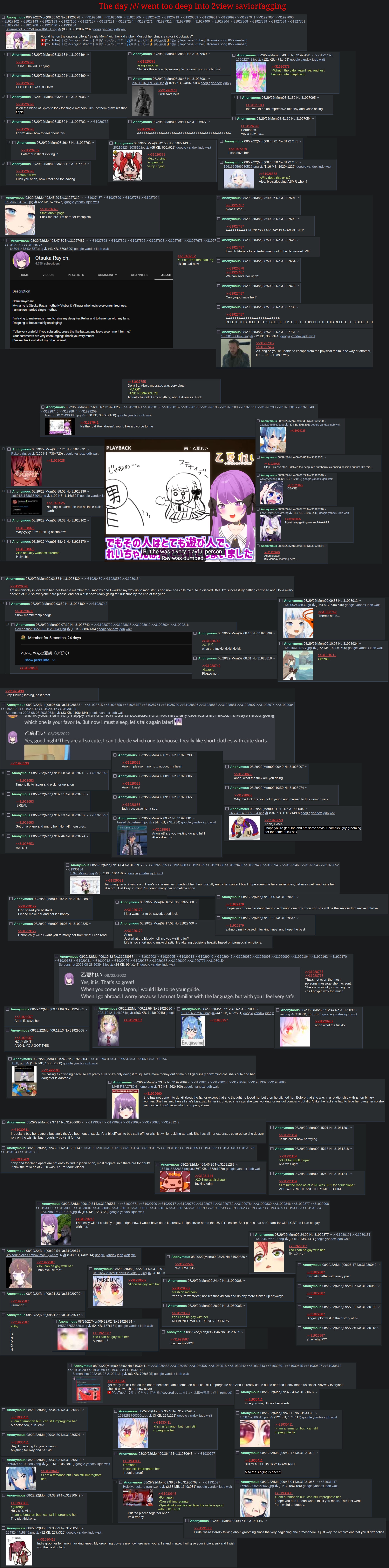>>460165 Есть Otsuka Ray. Single mom vtuber, как она себя величает. "Рейка", ее дочка, уже неплохо болтает. Это неплохой материал для тру айдол витубера. Лет через 8 правда. Там уже неизвестно куда пойдет индустрия. Могла бы ей канал передать. На донаты вырастила дитё, а потом уже оно будет на донаты матушку содержать. Если это не высокоуровневый отыгрыш, то человек буквально вырос на стримах, с самого почти рождения. Отдельно потешный факт, что чаттерсы у нее буквально считаются "отцами"