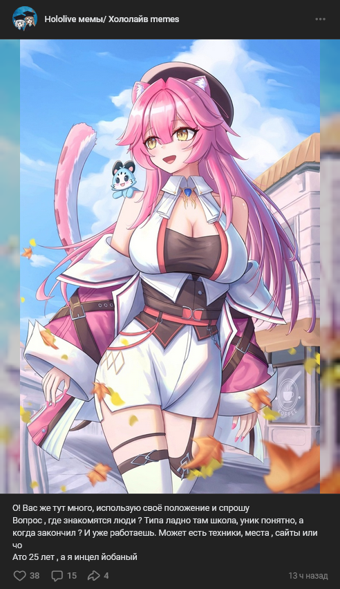 Она из образа выходит крайне редко (по крайней мере на караоке-стримах), и этим раздражает, хочется видеть реального человека а не кривляющийся образ. В этом плане мне другие Холо-певички больше импонируют. Они не кривляются как ебанутые, после каждой песни. Давай расскажи мне что она не такая на игровых стримах, сорян, я это говно не смотрю, потому что как стример Лизка невероятно скучная.