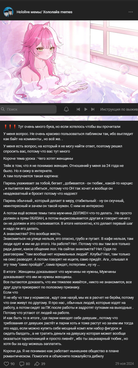 Впервые послушал и посмотрел последний трек Гуры (без клипа он представляет ровно 0 ценности, даже учитывая, что это Гура). Как я понял из содержания + контекста, это должен был быть лучший нот-лайв перформанс Холо с момента, когда Гура стала лицом компании. Почему всё так хуёво? Это проблема конкретно Холо или весь витубинг настолько плох в плане музыки?