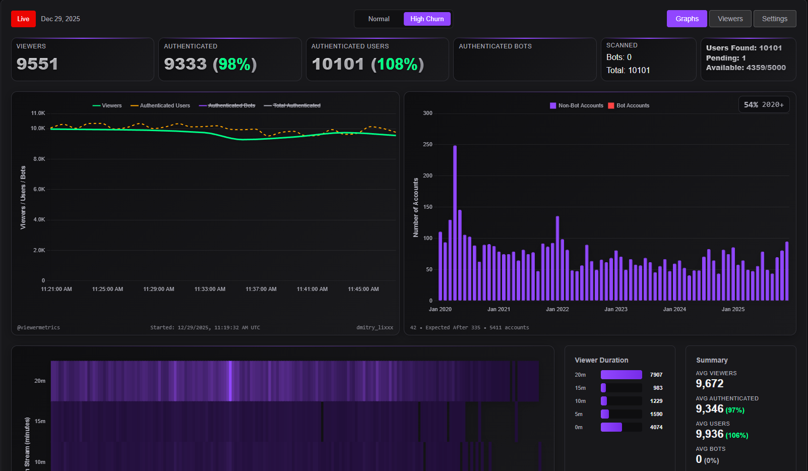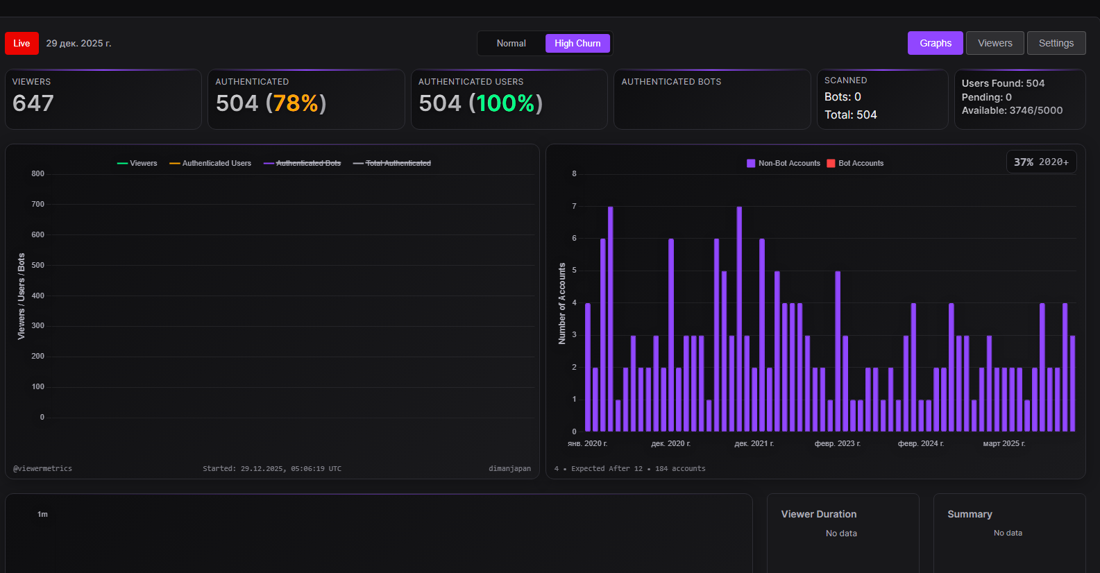 Короче посидел с вьювер метрик сейчас, и походу лысан не крутит. Единственное, НЕаутентифицированных многовато, где-то 70-85% в среднем аутентифицированных. not good not terible. Но потом аутентиф. догоняет онлайн и разрыв не увеличивается. Пытался сравнивать с другими в ирл в общениикстати даже не видел, что у него общение, я думал ирл, и у робасиди тоже общение. Чуть больше в среднем 85-95%, у роба около 90% держится, на спорт эвентах в категории общение прямо ~70% и было . Но встречал и 155% от онлайна аутентифицированных, и без ботов, хз что это. Парочка таких была