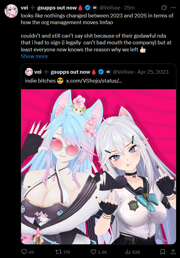 >>469939 Ну вот в Висёдзё витюберши сейчас старательно открещиваются от корпы (как когда-то от Сильвервеёл, мхех). Напрямую пока не посыпались, но явно скоро начнут рвать контракты.