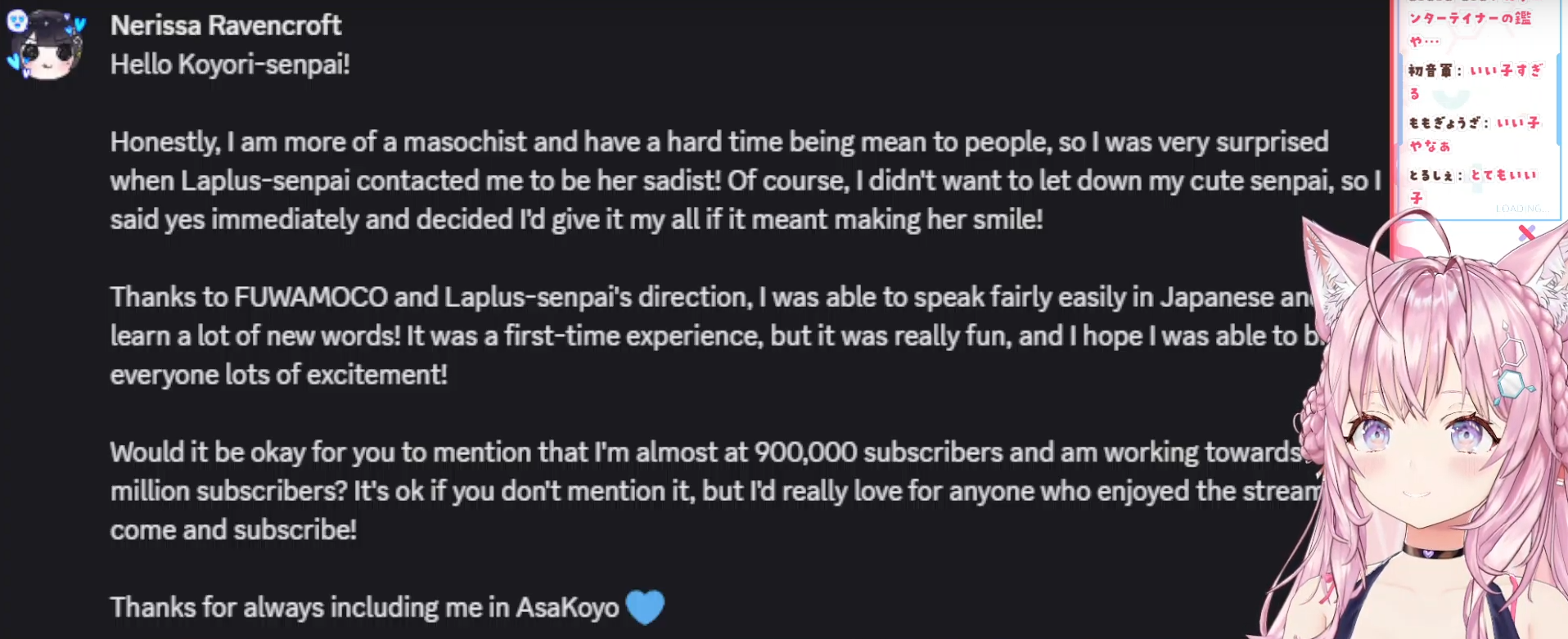 https://www.youtube.com/watch?v=8BvRrV1WSzg Нерисса запустила партизанский стрим, когда я спал и сбила мне серию, нахуя я свой график сна ломал... Выжимка: - Рада что всем понравился бдсм асмр стрим с Ла+, хоть и были некоторые комментарии, что девочкам неприятно, всё было по согласию и все кайфанули - Рада была побывать в обоих ролях, госпожи и мазохистки, было волнующе, лол - плёткой хлестала только задницу Ла+ и свою руку, так как не хотела никого бить, а Ла+ ОЧЕНЬ СИЛЬНО настаивала и хотела этого, рука к концу стрима была красная, что девочки переживали за неё - 3д жижи было без сценария, всё на уровне заметок "Нерисса и жижа смотрят на картину" "жижа сидите на толчке и есть тост", "Нерисса рожает яйцо", она даже не сказал Нериссе про старика, так как Нерисса скорее всего бы отказалась. Единственное что было запланировано, это их музыкальный номер с Мори - После просмотра The Summer Hikaru Died теперь боится принимать душ в номере, да и вообще боится японский хоррор фольклор - в Ванкувере исполняла Wannabe от Spice Girls с фувавой, хотелось бы это увидеть... - Внезапные проблемы со здоровьем, прошла полное обследование в японской больничке, сказали стресс, но всё ещё ждёт некоторые результаты анализов - Батя Папарисса капризничает и не хочет дебютировать на стриме в честь 900к, говорит что достоин миллиона, лол Также он придумывает совершенно новый лор, который перекрывает лор Риссы, чем её уже достал, кек - в честь миллиона хочет провести стрим со ВСЕЙ семьёй, когда они соберутся Спасибо за внимание.