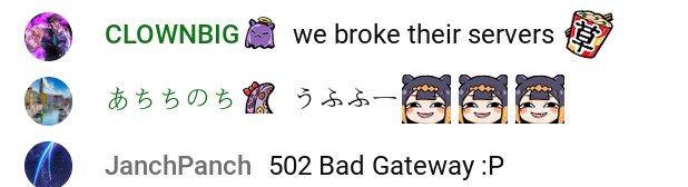 >>472781 > То есть когда вкладка с первой же минуты лагать начинает из-за шестизначного числа зрителей это другое? Кол-во зрителей не причём, у тебя может лагать даже стрим с мёртвым чатом, потому что когда ты открываешь чат заново прогружаются эмоуты которые тебе высвечиваются над полем ввода. SVG юзать для эмоутов это полный дебилизм, так никто не делает, его максимум это логотипы на сайтах.