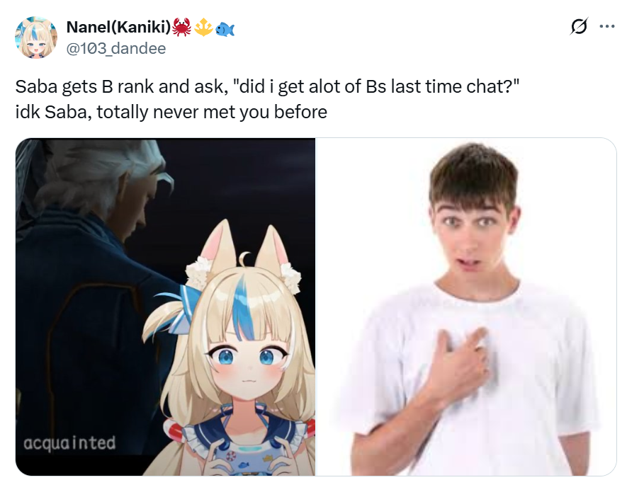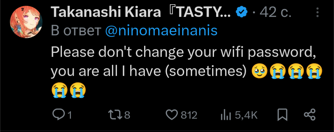 >>475498 >Риса У меня есть подозрение, что Нерисса вообще даже не в отеле с ними тусуется, а живёт у друзей, так как она не была ни на одном стриме у Мори из отеля, ни в одном твиттер спейсе остальных девочек, её даже никто не упоминал ни в одной из историй, будь то пицца вечеринка и прочие, единственное что за всё это время было, это твит от собак на пике. Кажется она снова тусуется со своей компанией малоизвестных флештуберов и инди, среди которых есть мужики (отсюда и секретность, лол), как и в прошлом году во время BD, когда её спалили, кек.