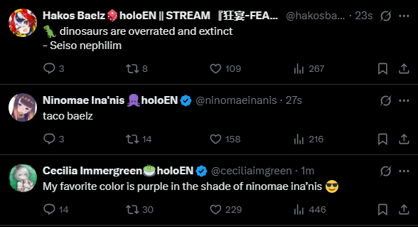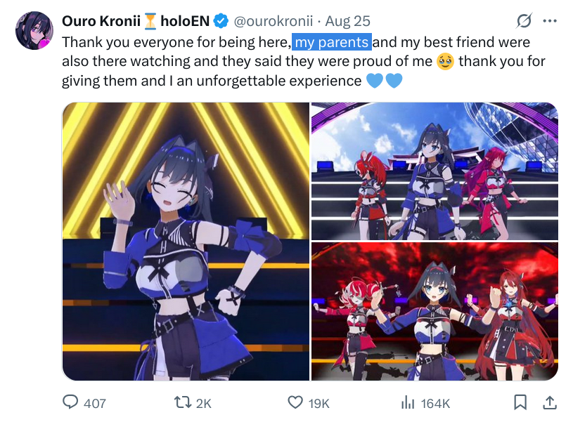 Тут посмотрел полностью день первый концерта. Пожалуй, мой топ: Все появления Бей и её поддержка Мифа. Песня Крони+Айрис и Товы-сан и их взаимодействие после. Алсо какая Това низенькая:3 и, наверное, Крони тут лучше всего отработала.
