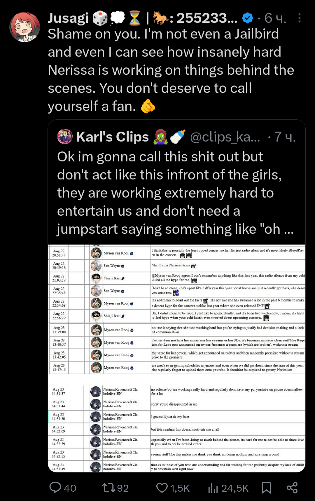 >>475410 Нерисса уже осадила твиттерных педиков во время твиттер спейса после концерта. Автор того твита роняя кал уже удалил его, осталась только ветка на реддите. Вообще оно того стоило, после всего инцендента, который явно был замечен менеджером, она наконец стала писать в твиттере в этот же день о концерте и даже провела твиттер спейс после, что уже хорошо.