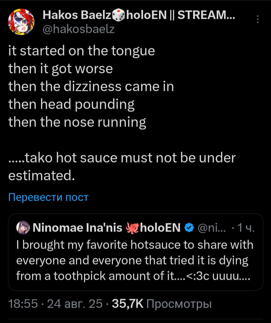 >>475028 Нерисса включила режим стервы и выбила себе скрытый отпуск после длительной японской арки, была слишком занята семьёй и племяшами с сёстрами, после концерта вернётся в строй, уже обещаны игровые коллабы с Шиори, кажись будут House of Ashes играть. >Честно скажу, хуй знает, зачем джейлберды смотрят её. Мы смотрим её не из-за игорей, это уж точно, для игродаунов есть Бибуу и прочие, нам просто нравится слушать её истории и тирады про всё подряд. Конечно твиттер спейс или комьюнити пост от неё не помешал бы на этой недели, а то совсем нет никакого хайпа по AFO концерту, а у неё сегодня ещё и Ворлд Тур а Нью Йорке. Вот вам мои безумные умения.