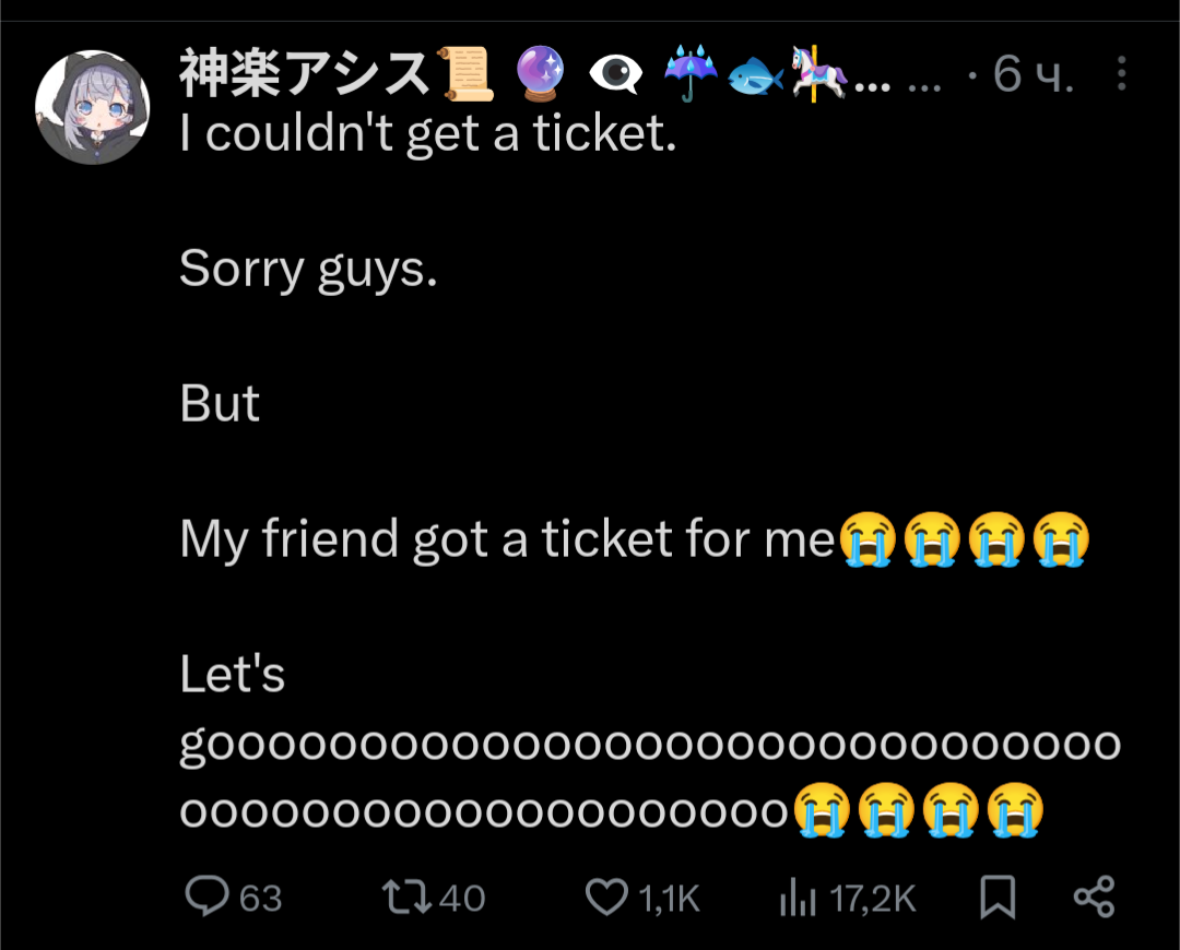 Ну так что по концерту? Запомнил абов\белов, коллаб с шубой, стеллар, автофистеров и алл фор ван - вроде неплохо, но по солякам как-то вяло, условная Ириска и Фауна с прошлого года разматывают в хлам этот год. Хотя по коллабам тоже хуй знает, ибо в том году была бибидиба , да и заглавная тема лучше, чем в этом году. Хотелось бы во второй день АМЕ или на худой конец клярити, но это крайне маловероятно. Почему-то кажеться, что исполнят опениг Дандадана.