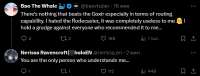 >>476884 Тем кто не хочет терять свою платёжеспособную аудиторию, Нерисса устроила получасовой "No Homo" разговор в мемберке всего из-за одного твиттерного педика, который твитнул лайк от неё.