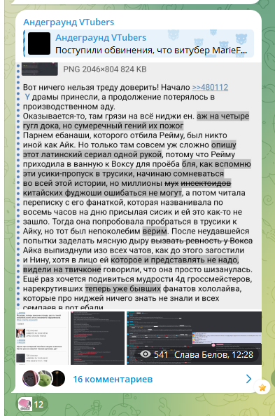 >>480550 Пчел, стрим заприватили, Фубуки отменила коллабу с Бибой и Фувамоко, чтобы разобраться в ситуации зашел в чат щебня узнать, а куда делись стримы, а там пацаны рекомендуют не лезть в ситуацию с Хачамой и по возможности репортить хайпожоров. У нас тут внезапная драма, с непонятным исходом наметилась.