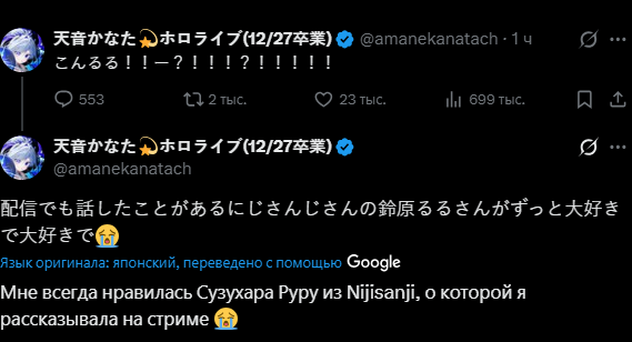 Удаление изображений с её участием и снятие подписки с неё не связаны с вышеупомянутым вопросом. Эти действия были предприняты мной после её публикации в соцсетях 20 сентября 2025 года — чтобы избежать возможных недоразумений относительно моего участия как создателя изображений её персонажа. Однако объяснить это публично я тогда не мог из-за закрытого характера взаимодействия между таланткой (госпожой Итидзё Ририка) и Cover Corporation, и из уважения к ним воздержался от комментариев.