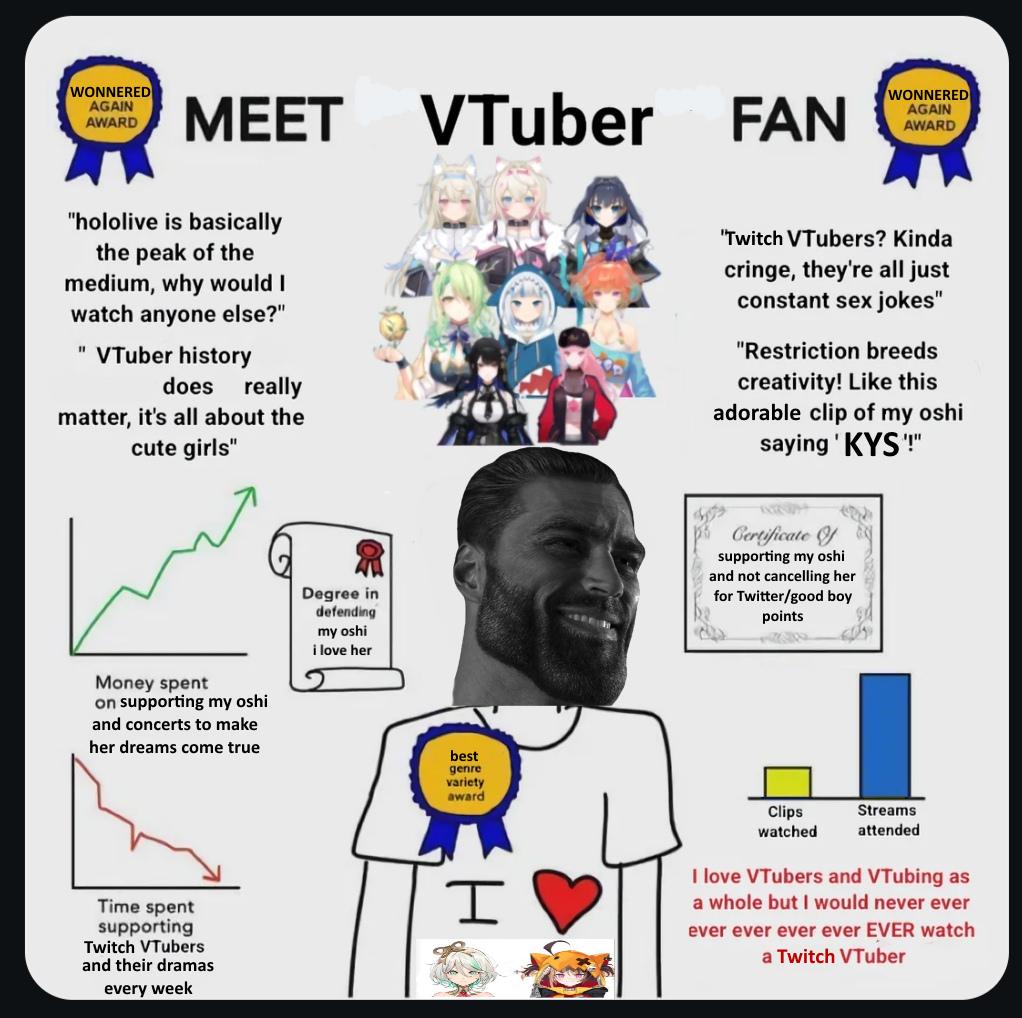 Слушайте, а может проведем свой V-tuber Awards? Да, нас тут не особо много. По моим подсчетам, максимум человек 15-20. Но всё равно интересно. Хуесосить всех налево и направо мы все мастера, а вот хвалят тут кого-то крайне редко. Хоть пусть под Новый Год приятные вещи о своих оши напишите. А я это всё соберу и подсчитаю, и напишу большой пост, или может даже видео сделаю с монтажиком, если не лень будет.