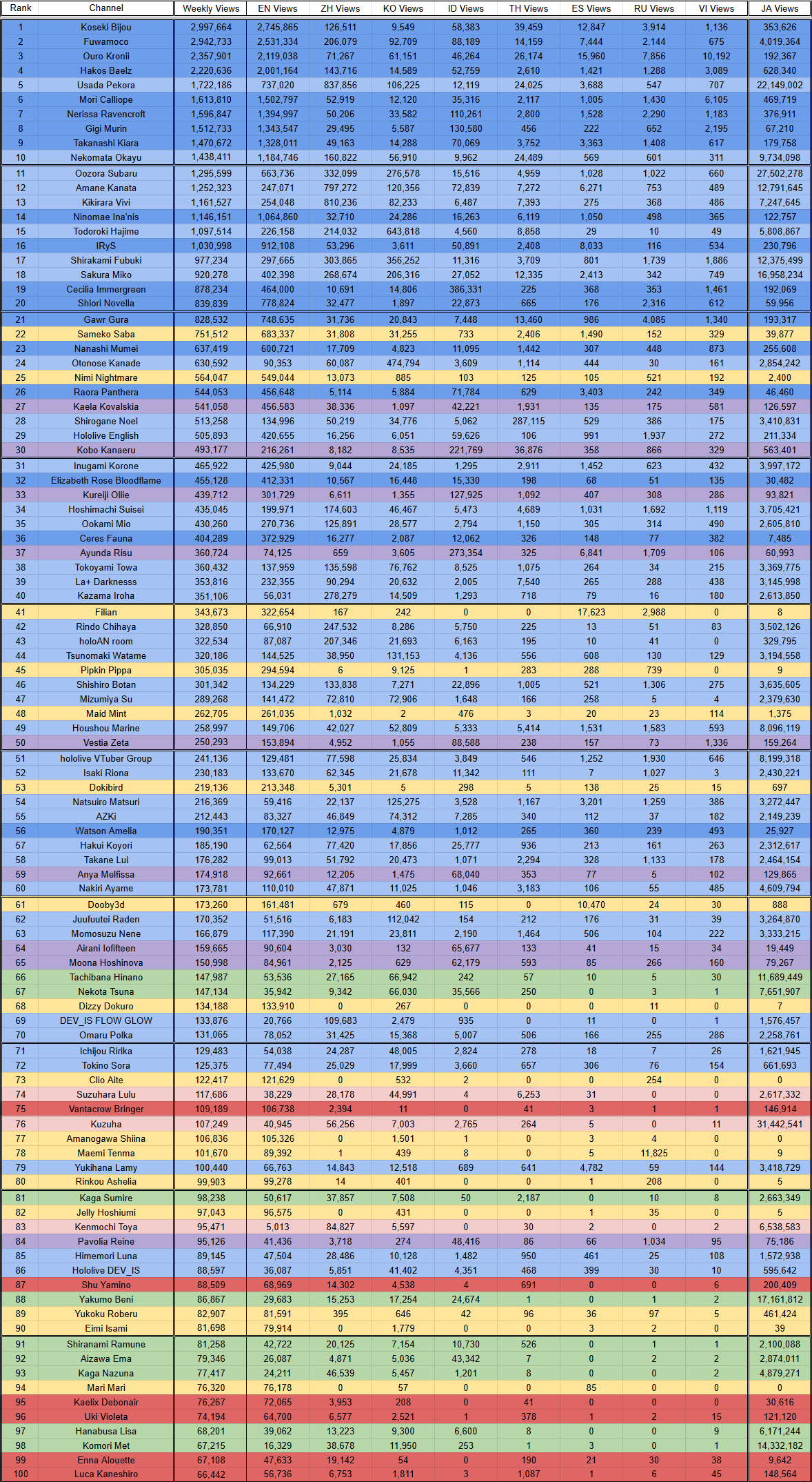 >фувамок есть свои клипперы с кучей контента по ним Англоязычных, да. Их у каждой чубы из Холо кроме совсем ноунеймов японских полно. Но рядовой житель этой страны как на них выходит и зачем? Контент у них специфичный и с этой страной не связанный. В отличии блять от Филлиан, ага. У которой ру-просмотров по этой таблице как у Бау-бау. Что крайне сомнительно.