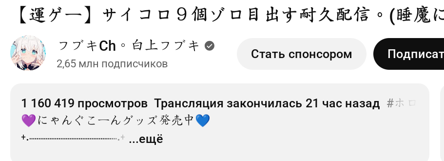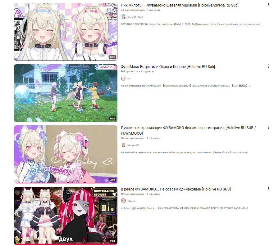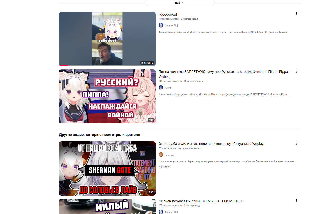 Где блять эти десятки русаб-клипперов нарезающих Фувамоко, на которые сбегаются русские? Я вот дрочу поиск, смотрю сейчас самые популярные клипы Фувамоко за месяц в попытках найти тот скрытый хидден-гем что делает ру-сабы для Фувамоко с пятизначными числами. Или ты увидел русские название от Ютуба в названиях клипов с Фувамоко или решил что это русаберы-клиперы? Спешу тебя разочаровать, солнышко, это нейросетка от Ютуба. Причем крайне дерьмовая. Я даже в комменты к самым популярным клипам захожу в попытках найти русские комменты, но там их нет. Про Бибу я даже обсуждать не буду. Там очевидно, ей крутят ботов. Можешь мне сколько угодно рассказывать про популярность Бибу, я тебе просто скину пик с просмотрами Филлиан для сравнения (пик 3/4).