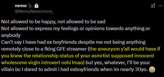 Не смей называть таким почетным словом (rоторое закрепленно за одной из лучших девочек JP) мерзкую, лживую GFE-ASMR-шлюху. Она нам и мне не жена, и не подруга. Просто рандомная шкура охуевшая в своей безнаказанности настолько, что может буквально ссать на свою фан-базу и те стерпят.