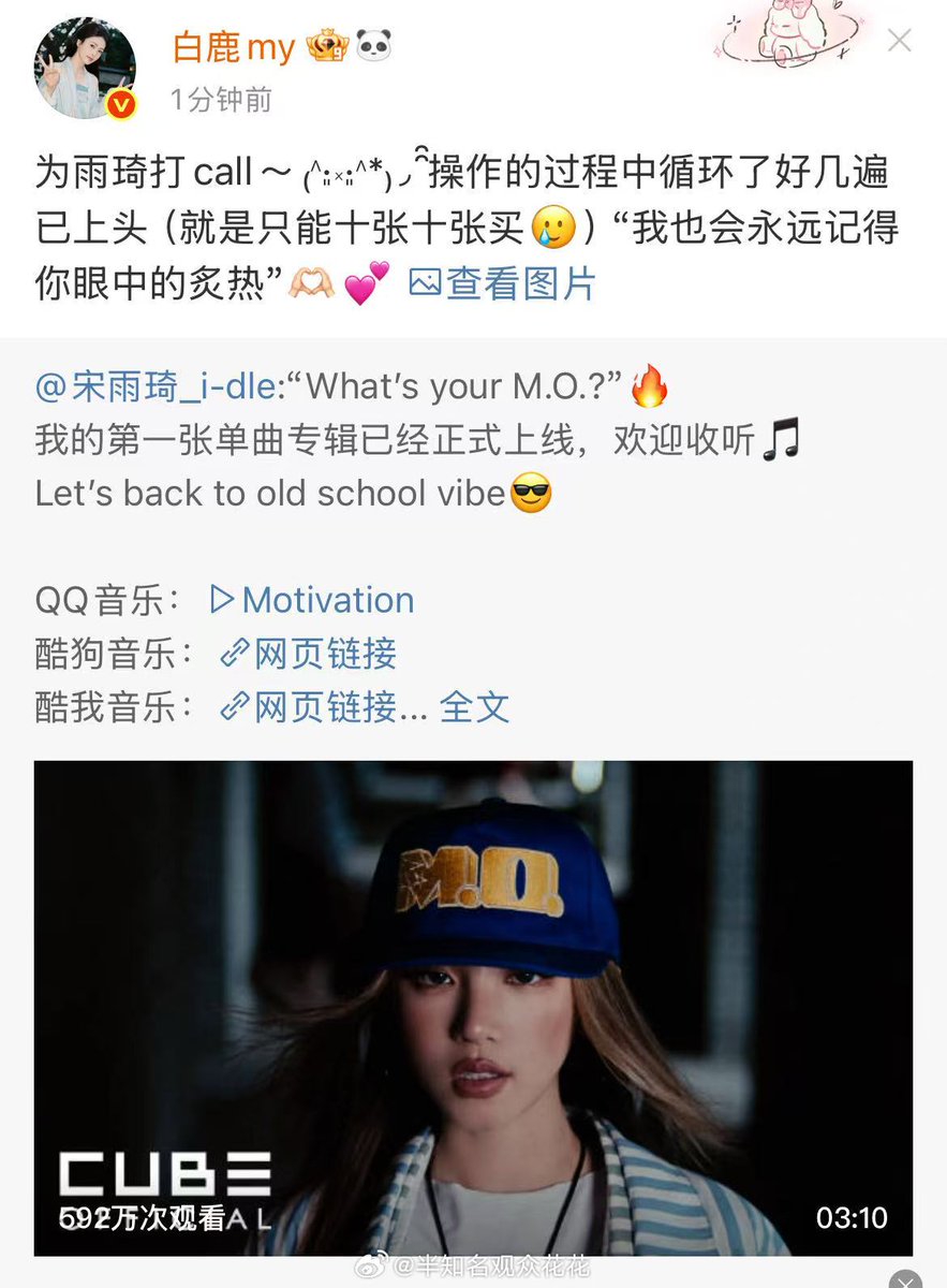 Одна из самых популярных китайских актрис BAILU поддержала камбек YUQI. Подружка Yuqi репостнула в своем WEIBO(30 миллионов подписчиков) информацию про альбом, купила 835 копий альбома, а так же поделилась что заглавка ей очень понравилась. Yuqi уже успела поблагодарить ее за это под постом. На данный момент Bailu - одна из самых востребованных китайских актрис. В этом году уже вышло три дорамы с ней в главной роли. Yuqi рассказала что одну из них она смотрела в онгоинге и пыталась узнать спойлеры к концовке.