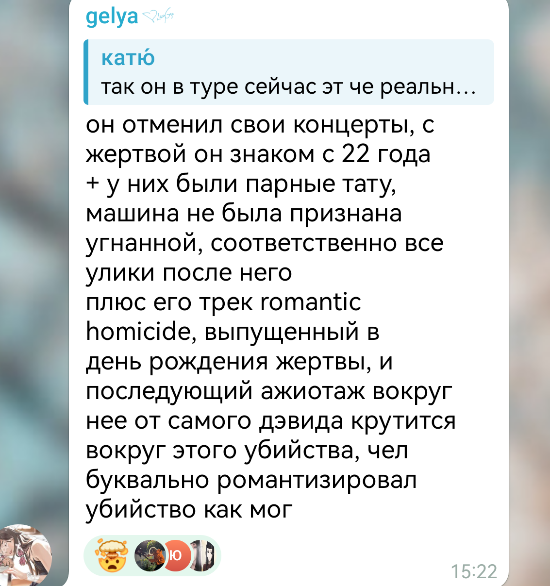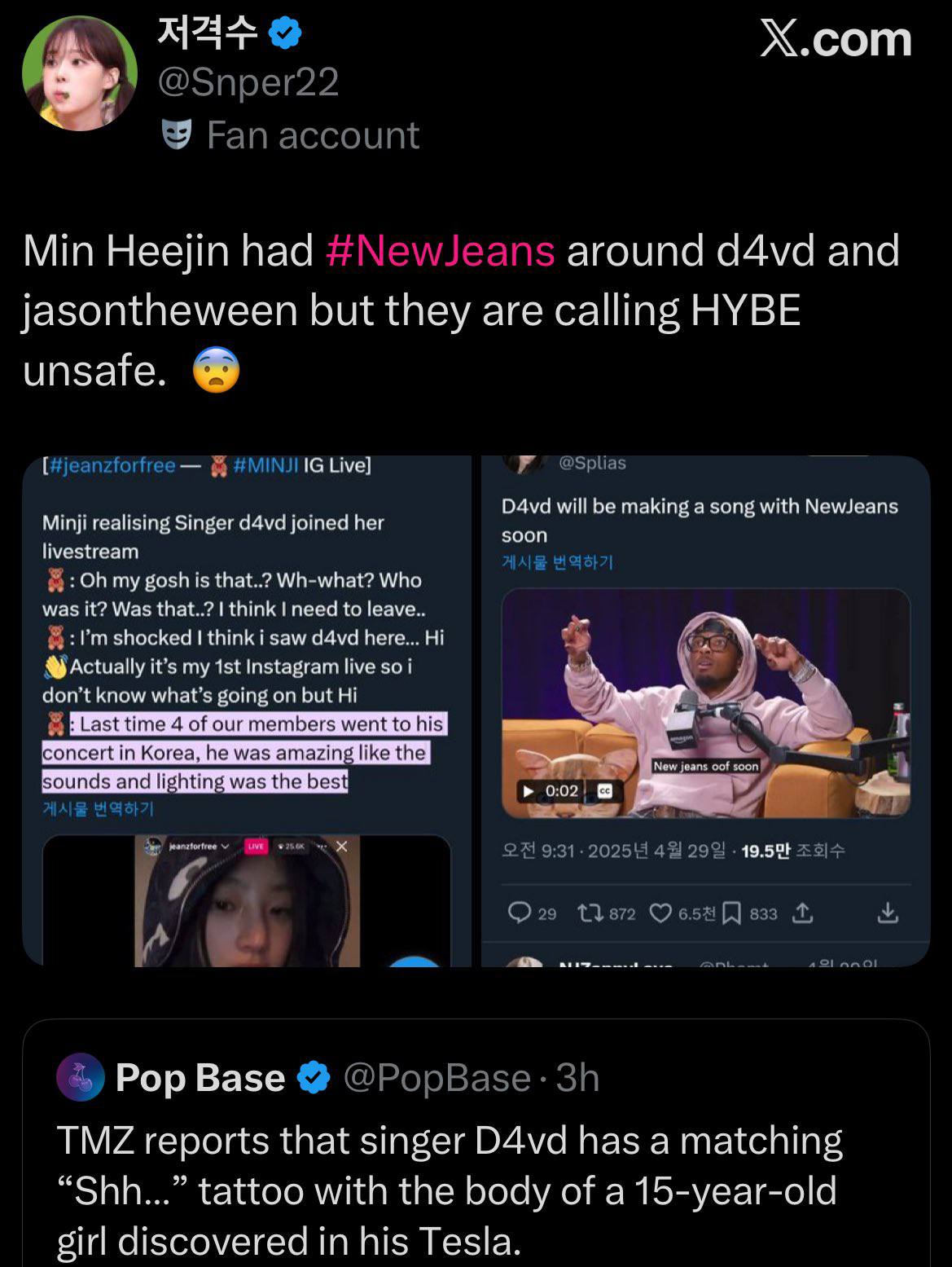 >>1326676 > на концерт репера D4vd > Но 2 дня назад у него в машине нашли труп 15летнейдевушки Разве это не повод для задержания и отмены концертов? > NewJeans Minji затащила остальных мемберок на концерт Как будто она не знала