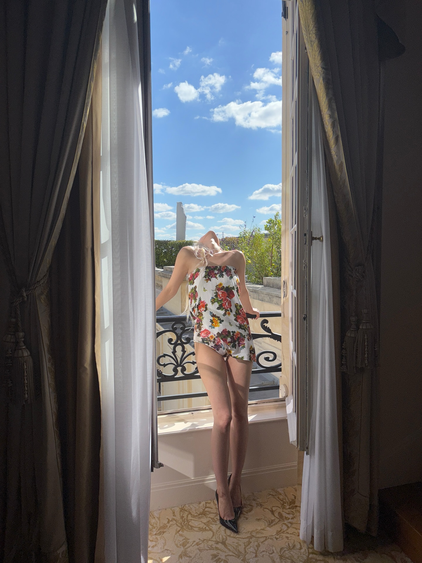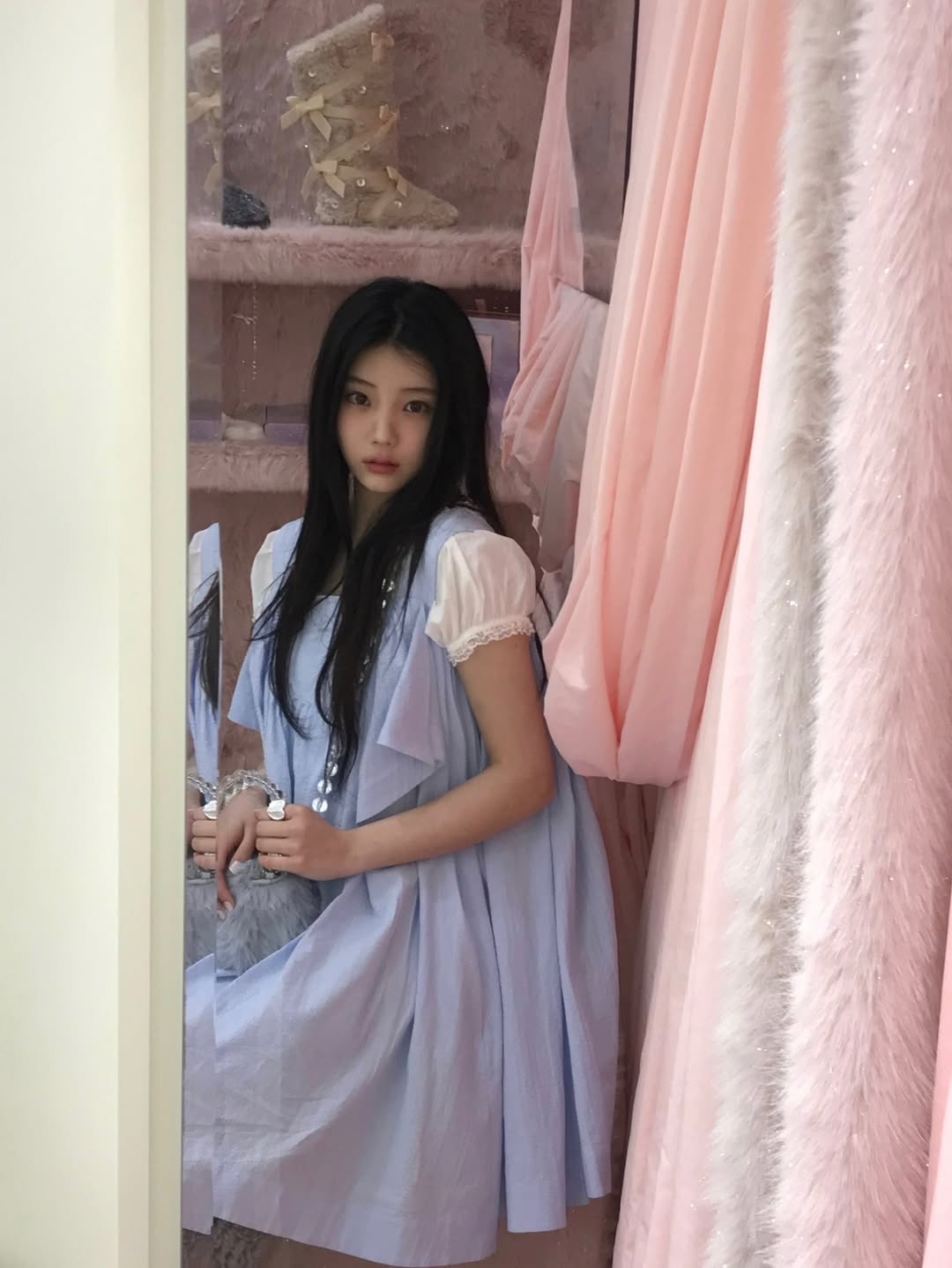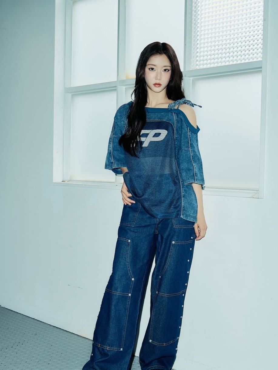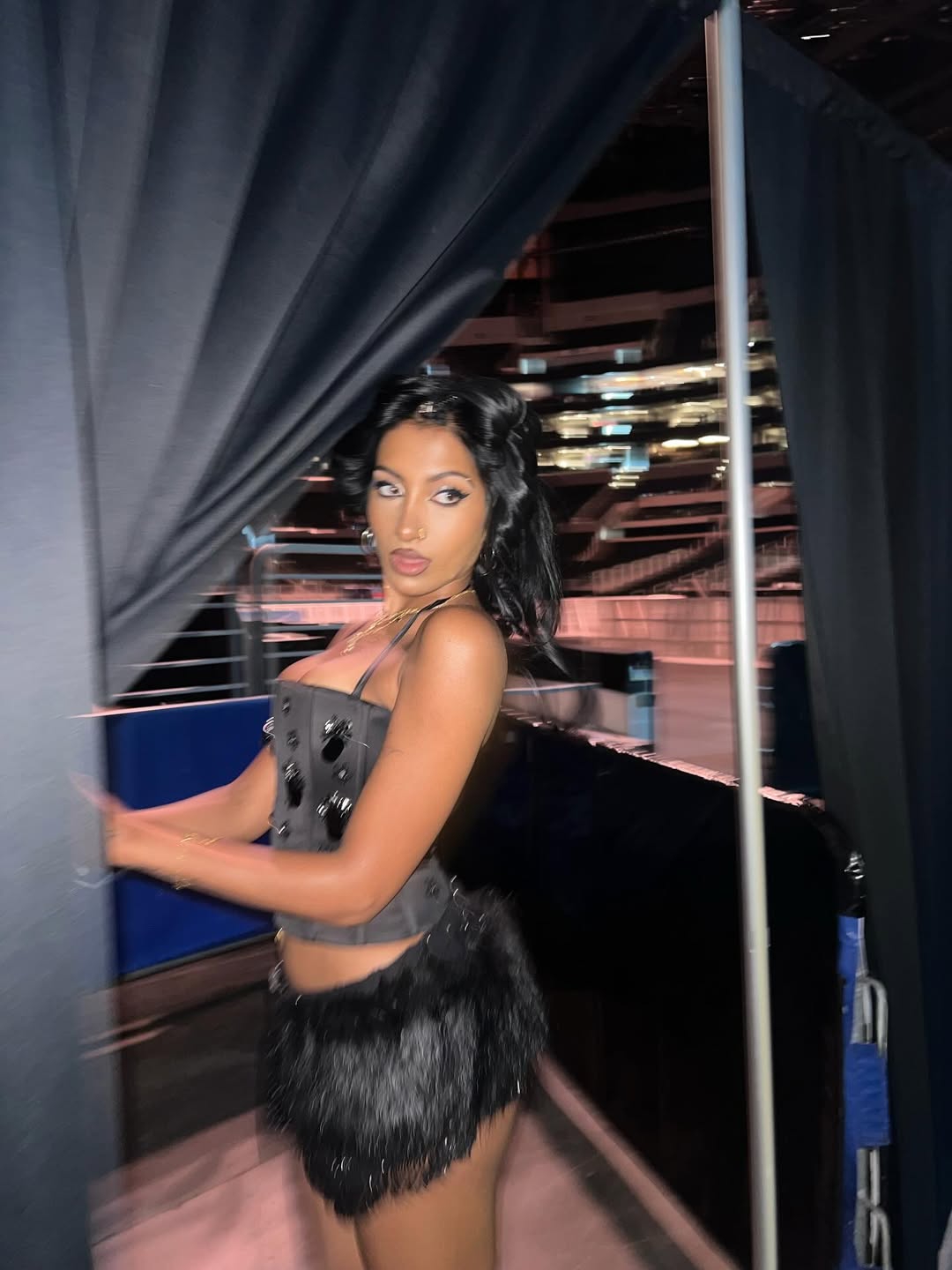 На шоу она появилась в комбинезоне нежно-голубого оттенка из кружева и шелка, который сразу привлёк внимание публики. Лёгкий блеск ткани подчеркнул её элегантность.
