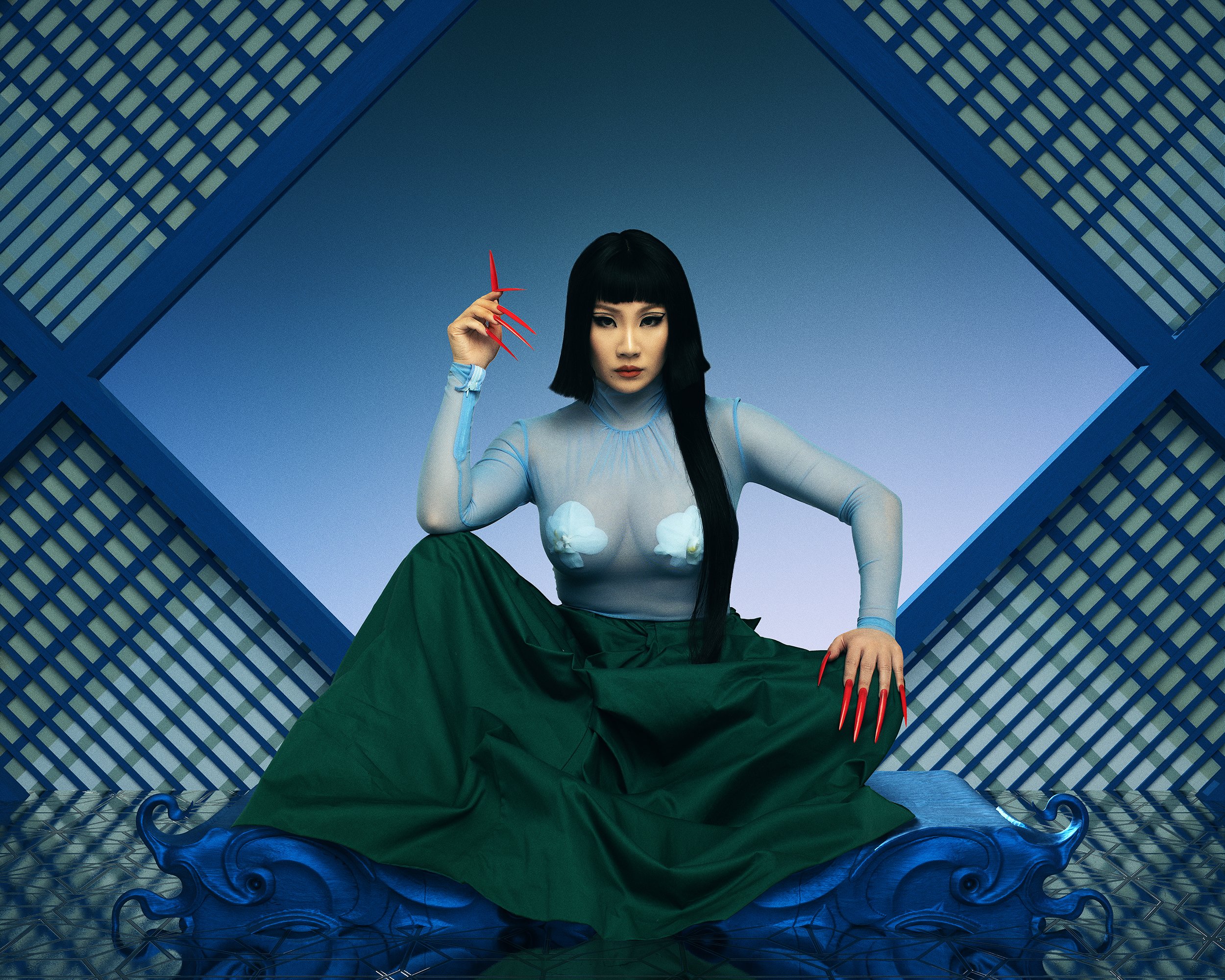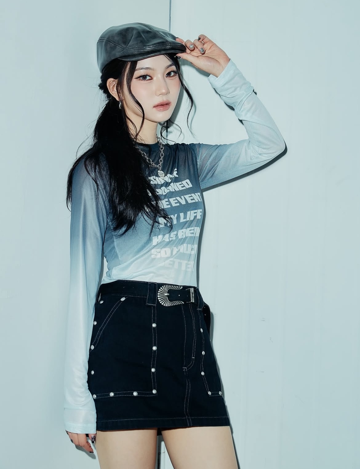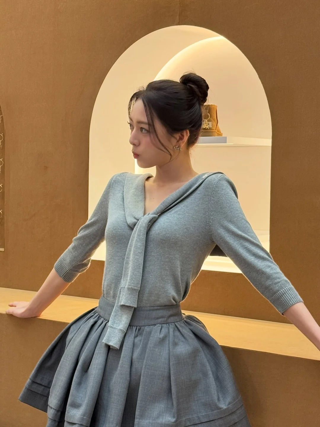 На шоу она появилась в комбинезоне нежно-голубого оттенка из кружева и шелка, который сразу привлёк внимание публики. Лёгкий блеск ткани подчеркнул её элегантность.
