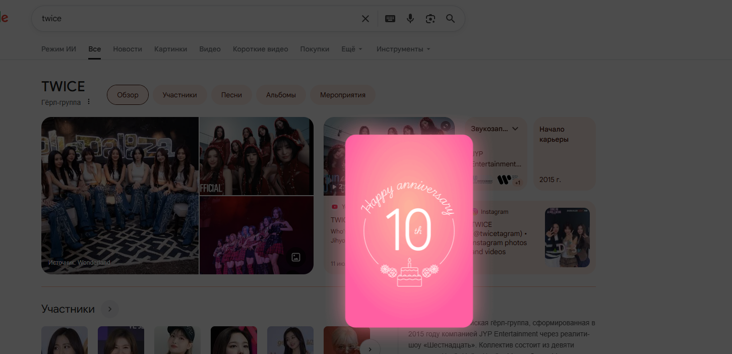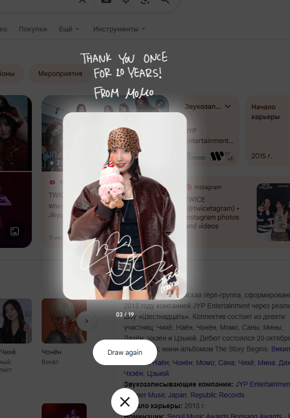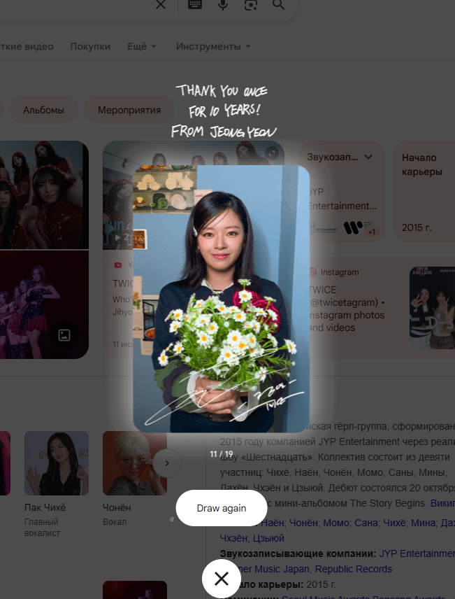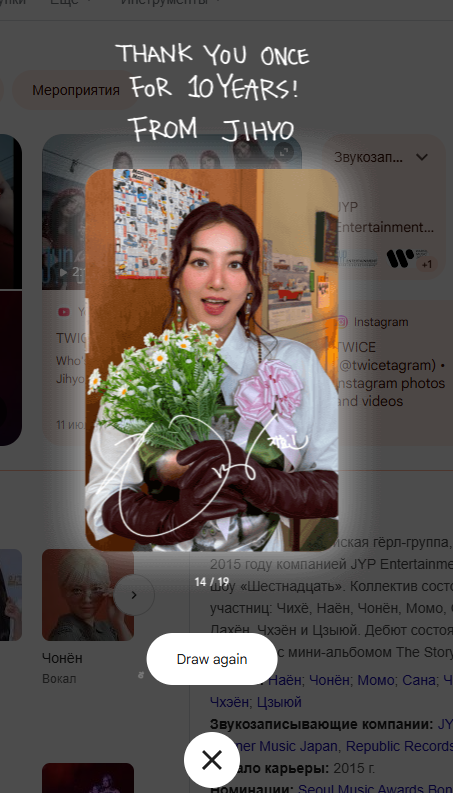 Ровно 10 лет назад на свет появилась одна из самых лучших групп, самые семейные, смешные, красивые, талантливые Twice. Им Наен, Хираи Момо, Пак Джихе, Ю Чонен, Чжоу Тзуи, Ким Дахен, Минотазаки Сана, Мие Мина, Сон Чеен! Ура господа Twice 10 ЛЕТ!!!💥🍸💐 10 лет хорошей музыки, хороших мемов, хороших выступлений! Это история и мы ее часть, ПОЗДРАВЛЯЮ!