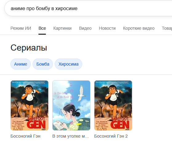 Последнее что я смотрел в детсве, это какой-то мультик, аниме или нет, но событие развиваются в японии, когда скинули бомбу на хиросиму, таким был мелким, что даже не вспомню че там было, но тогда меня зацепило