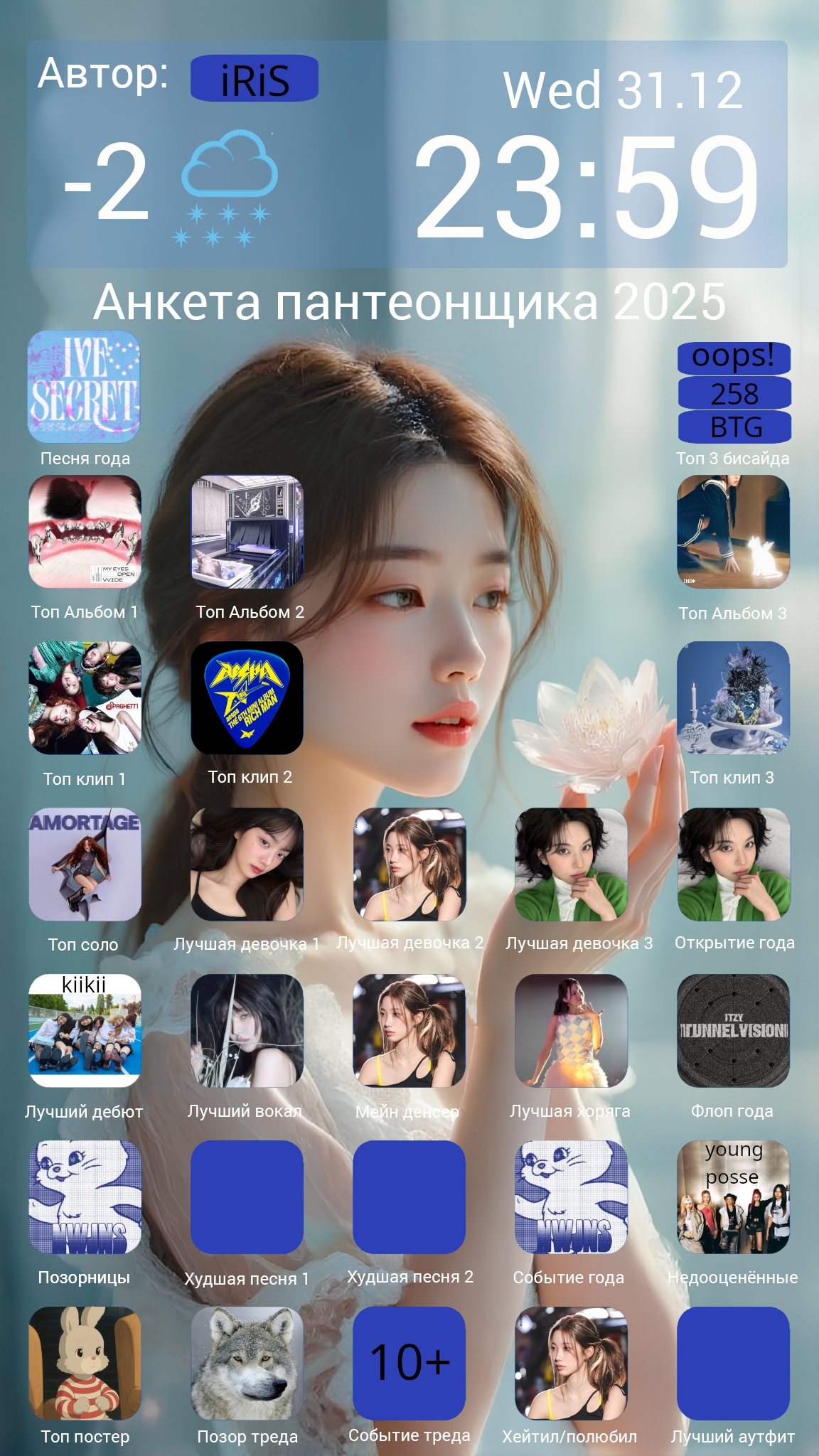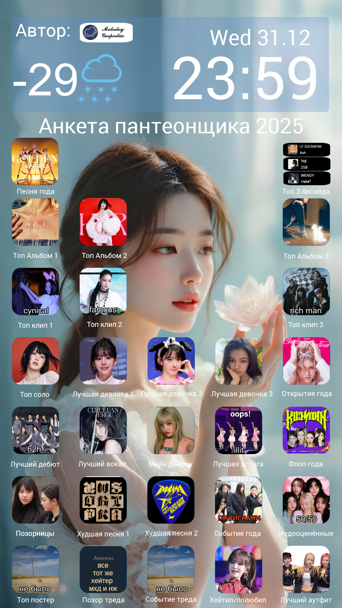 Это великий и единственный тред K-pop богинь в котором мы поклоняемся склоняя голову и любуемся их неземной красотой, встаем на их защиту не жалея собственной плоти. Да озарят они наш жизненный путь своей красотой, да воодушевят они своими голосами трудные наши пути, да даруют нам надежду своею любовь в темные дни, восславим безмерно наших богинь! Сидим под пледиком, пьем чаек и смотрит фанкамы уходящего года и новогодние ТикТоки богинь.
