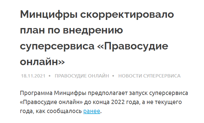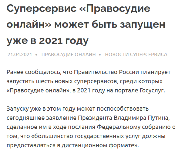 Электронное правосудие заработает уже в этом году, обещают чиновники https://www.kommersant.ru/doc/5876257 Подавать иски онлайн смогут не только граждане — через «Госуслуги», но и организации — через систему межведомственного взаимодействия, рассказали в четверг в судебном департаменте при Верховном суде. Но граждане получат доступ к электронному правосудию раньше чиновников: разработка суперсервиса «Правосудие онлайн» находится в завершающей стадии, а часть функций должна заработать уже в этом году. Организациям же придется ждать как минимум до следующего года.