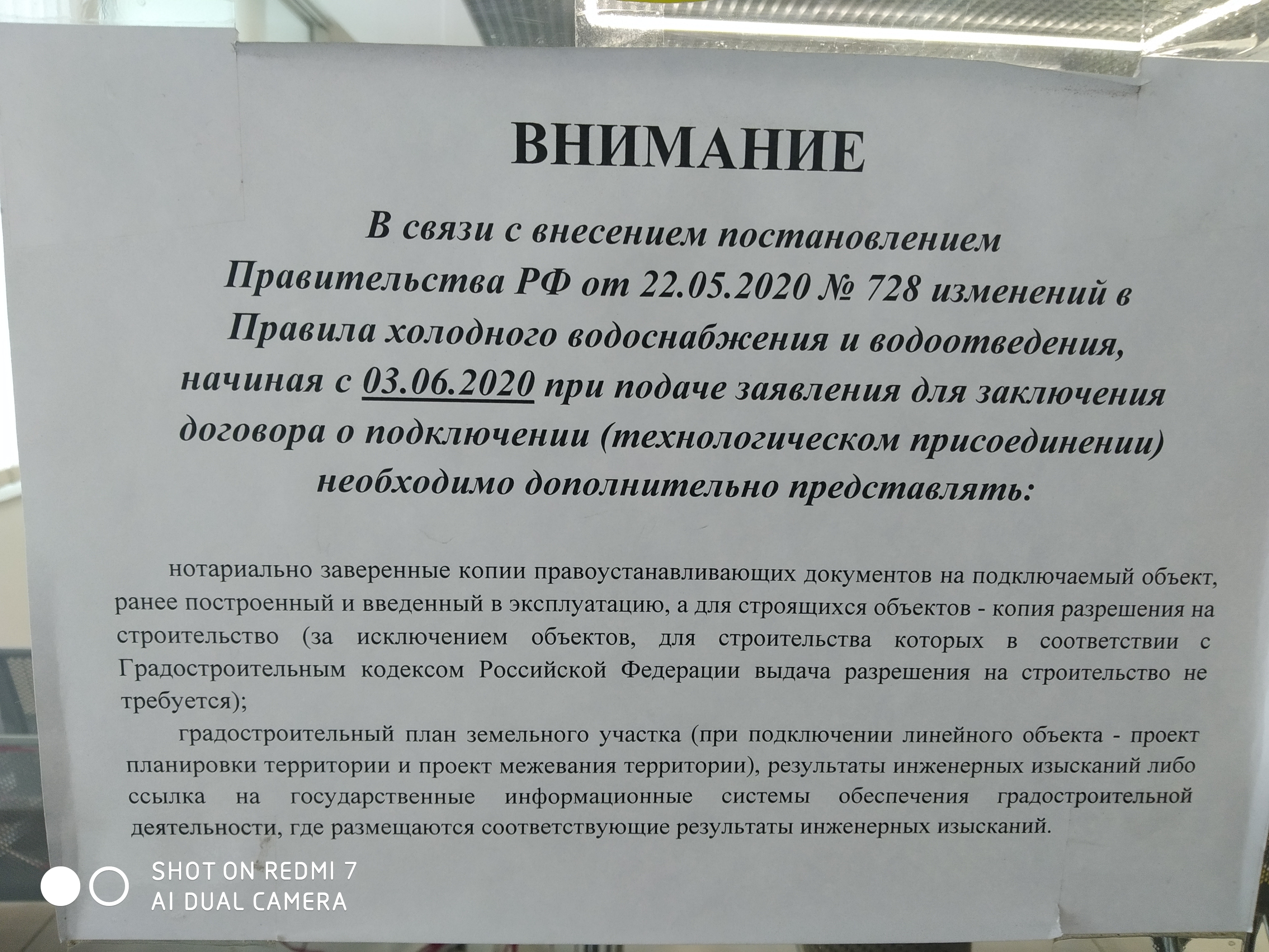 >>49412 >>49492 Лол, Вася, иди и залупайся на них, тебе в уши бессовестно нассали. Вот тебе актуальный текст Правил в той самой редакции: > 17. К заявке абонента прилагаются следующие документы: > а) копия документа, подтверждающего право собственности или иное законное основание возникновения прав владения и (или) пользования на объект у абонента, в том числе на водопроводные и (или) канализационные сети и иные устройства, необходимые для присоединения к централизованным системам холодного водоснабжения и (или) водоотведения, приборы учета. Абоненты, не имеющие непосредственного подключения к объектам централизованной системы водоснабжения или водоотведения, принадлежащим организации водопроводно-канализационного хозяйства на праве собственности или ином законном основании, обязаны представить акт разграничения балансовой принадлежности и эксплуатационной ответственности с лицами, владеющими на праве собственности или ином законном основании водопроводными и (или) канализационными сетями, составленный по форме согласно приложению N 1, за исключением случаев, если объекты таких абонентов подключены к бесхозяйным сетям, а также если осуществляется неорганизованный сброс поверхностных сточных вод с территорий абонентов в централизованную систему водоотведения; > (в ред. Постановления Правительства РФ от 22.05.2020 N 728)