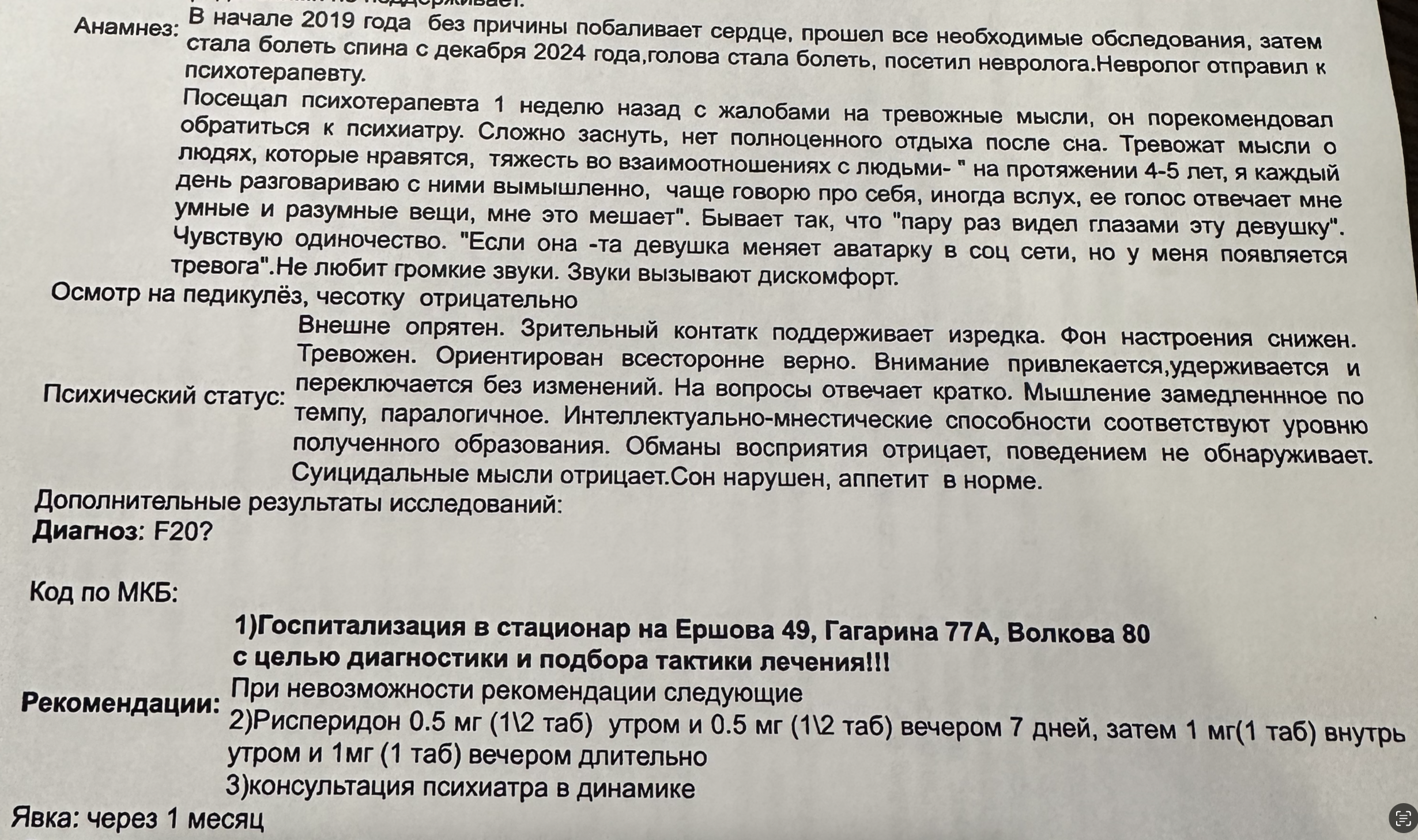 Сап двач. Буду благодарен если посоветуете план действий. Постараюсь кратко всё описать: много лет бывают периодические покалывания в сердце, боли в спине (2 ст сколиоза, 19гр, в частной клинике), в начале года устроился на работу и решил заняться здоровьем. Кардиолог и ортопед, оба частные и независимо друг от друга сказали, что стоит обратиться к неврологу. У него я прошёл тест, который показал клиническую тревогу. Решил пойти к психотерапевту, которой за приём я отдал 5к. Мы разговаривали полтора часа, обсуждали очень много всего, посоветовала пойти к психиатру, либо продолжить занятия с психотерапевтом, потому что она не сторонница выписывания таблеток. В итоге мне после такого душевного разговора легче не стало, я решил пойти к психиатру. Результат на пике, там всё очень кратко конечно. Идти даже на дневной стационар в государственные эти шаражки, указанные в пике не собираюсь. Рисперидон купил и начал пить по пол таблетки утром и вечером. Самые тревожные и тяжёлые мысли стали ощутимо реже, если появляются то легче переносятся не суицидальные, а к примеру воспоминания о взаимодействии с людьми. Но в качестве побочных действий у меня это повышенная сонливость, тяжесть в общении вживую, бывает как будто приходится выдавливать из себя слова и очень СИЛЬНОЕ сердцебиение в случае большой физической нагрузки или большого волнения. Было пару раз за дня 4. Совет мне нужен, так как я закончил магистратуру в конце июня, и должна придти повестка. Запас в 2 градуса по сколиозу доверия не внушает что-то, а тут написано "F20?". Перспектива откосить по нему кажется интересной, но возможно проверить и если он есть, подтвердить без дневного стационара? разговоры с воображаемыми людьми как будто часть меня и я не знаю зачем избавляться от этого, образовавшуюся пустоту я всё равно ничем не заполню