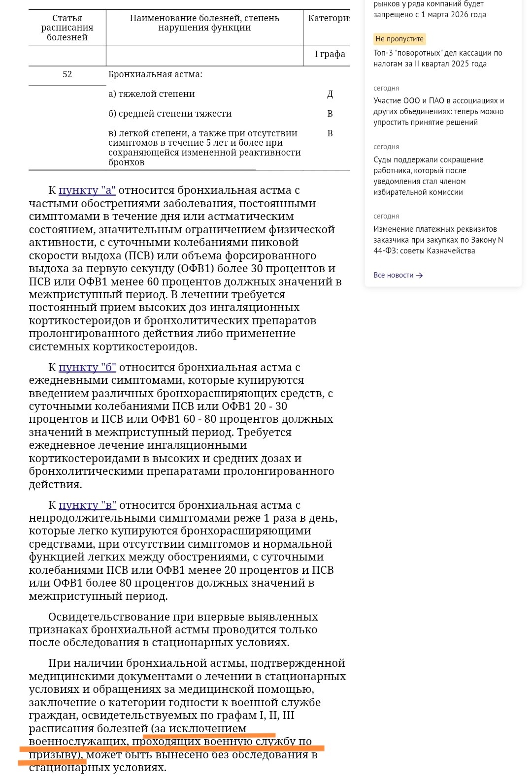 >>76567 Так а там разве не отправляют к пульмонологу + там в категории в 52 статьи написано также про отсутствие симптомов в течение 5 лет (у меня симптомы были, но это не суть), то есть предполагается и отсутствие бумажек, что ты обращался за помощью в течение 5 лет. А подтверждение того, что у меня астма была - есть. Завтра в военкомат пойду.