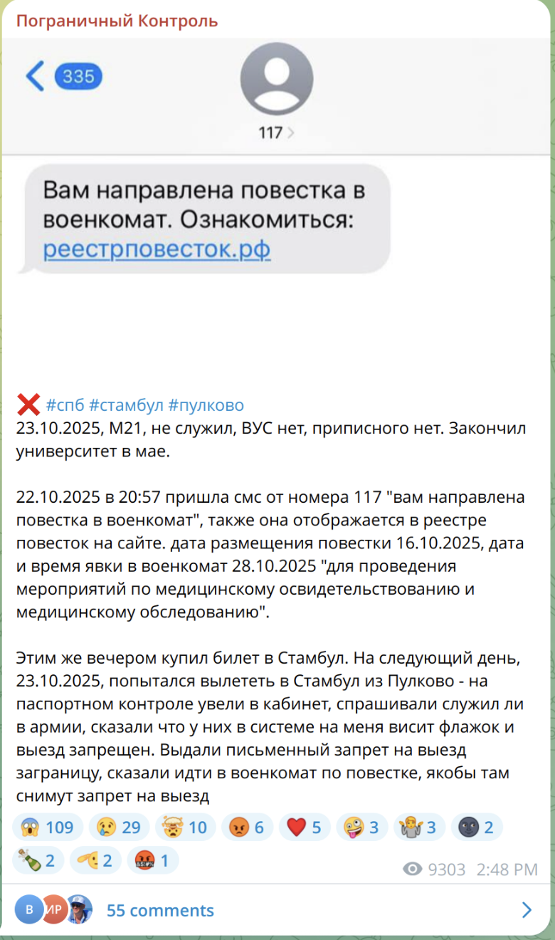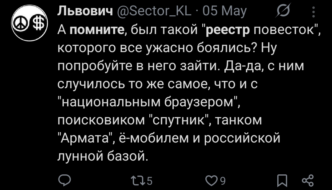 -- Вообще, почему я задумался, тут в треде в эмиграче анон написал, что ему прошлой осенью позвонили и попросили придти на сверку. Следом выяснилось что в почтовом ящике уже месяц лежала повестка. Он решил тут же улететь, теперь релокант.