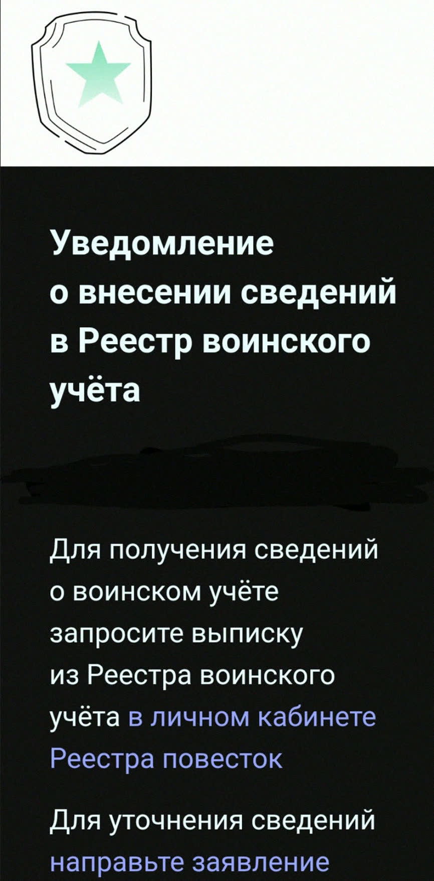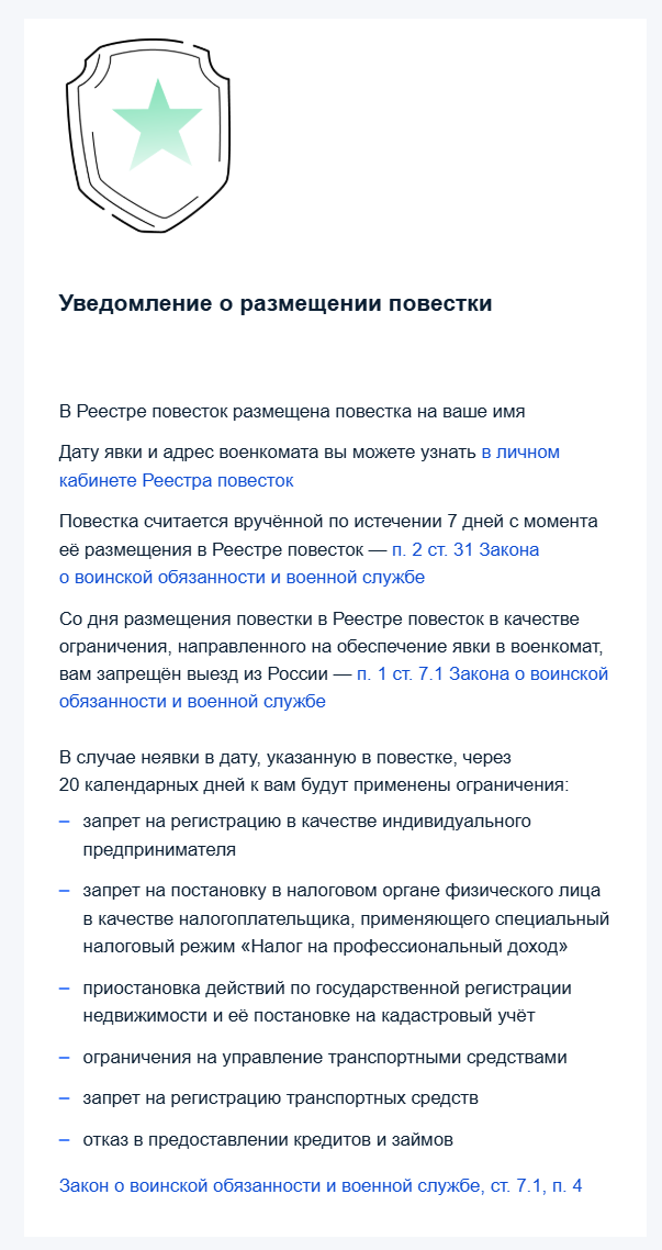 >>75893 Есть еле-работающий сайт, есть возможность там зарегаться. ВСЕ. Еще не видел ни одного случая отправки повесток через этот реестр, ни включения каких-то санкций, с ним связанных. Прошлой осенью объявляли о запуске реестра в тестовом режиме в 3 регионах, но по результатам будто бы все заглохло просто.