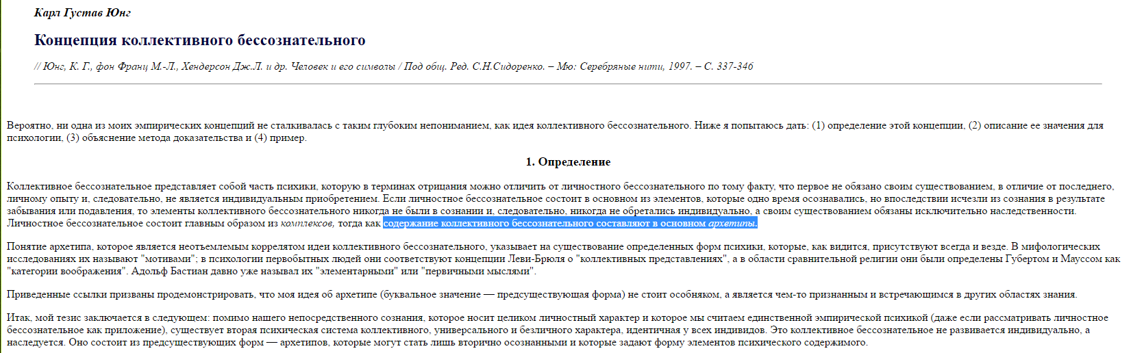 "Вероятно, ни одна из моих эмпирических концепций не сталкивалась с таким глубоким непониманием, как идея коллективного бессознательного. Ниже я попытаюсь дать: (1) определение этой концепции, (2) описание ее значения для психологии, (3) объяснение метода доказательства и (4) пример."