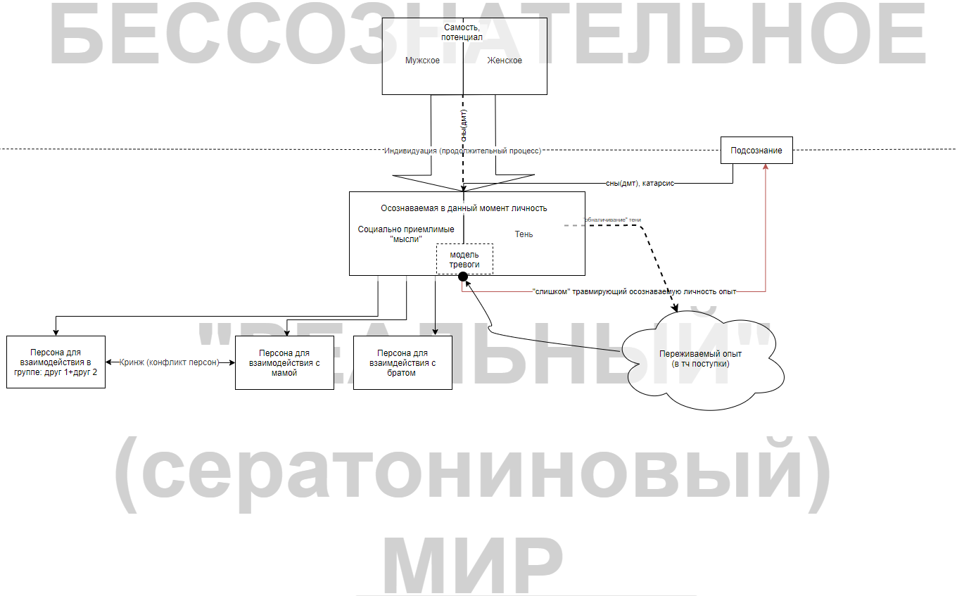 Обращаюсь к тем, кто шарит в Юнге. Я почитал книг (его и с его упоминанием), посмотрел лекций и решил накидать примерную схемку, как моменты им описанные взаимодействуют между собой. Она перед вами, но есть пара вопросов: