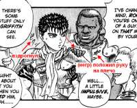 >>1193519>>1193523Гриффит даже не столько выебывался, сколько сам в это никогда искренне не верил. Весь этот пиздеж про равных это защитный механизм который был направлен на удешевление жизней его товарищей, так как он испытывал душевные мучения от того что его мечта уничтожает жизни и мечты других людей. Весь флешбек Каски в пещере был про это, а не просто про то что Гриффит очко продал.Алсо, там не столько стать другом, сколько просто равным. В манге было несколько моментов когда Гатс именно с этого бугуртил, мол терпеть не может когда Гриффит смотрит на него сверху вниз. Навскиду вкидываю пикрелейтеды, но по-моему там были еще моменты в которых это показано. То есть там чуть сложнее чем просто друзьяшкой быть. Ирония в том, что для Гриффит Гатс-то уже давно был друзьяшкой (вопреки своему пиздежу у фонтана), а Гатс об этом и не подозревал, ибо он бревно ебаное с говном вместо эмпатии. Он небось до сих не вдупляет что с Гриффитом вообще произошло.>>1193529В аниме (в оригинальной твшке) так же полностью вырезали Черепа и легенду о Гайзерике. Если что, Череп общепринято считается Гайзериком. Вообще, что ты тут делаешь, сейчас ведь спойлеров въебешь.