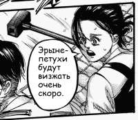 Армин и хлюпик вваляют люлей мимир, Эрон прозреет и весь в слезах приползёт к Микасе, умаляя её простить, понять и принять. Микаса вся в слезах снова говорит ему о любви, но убивает его.