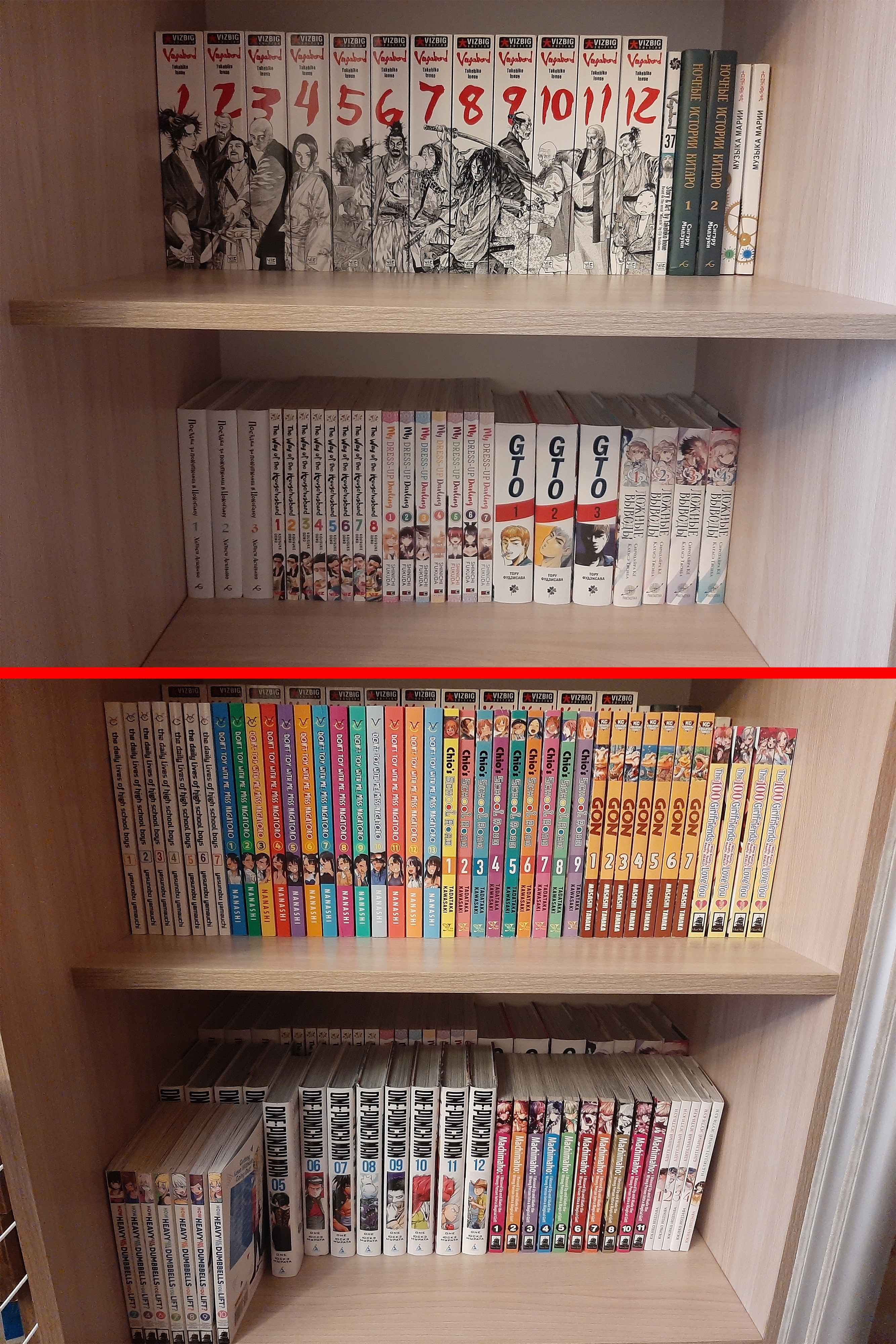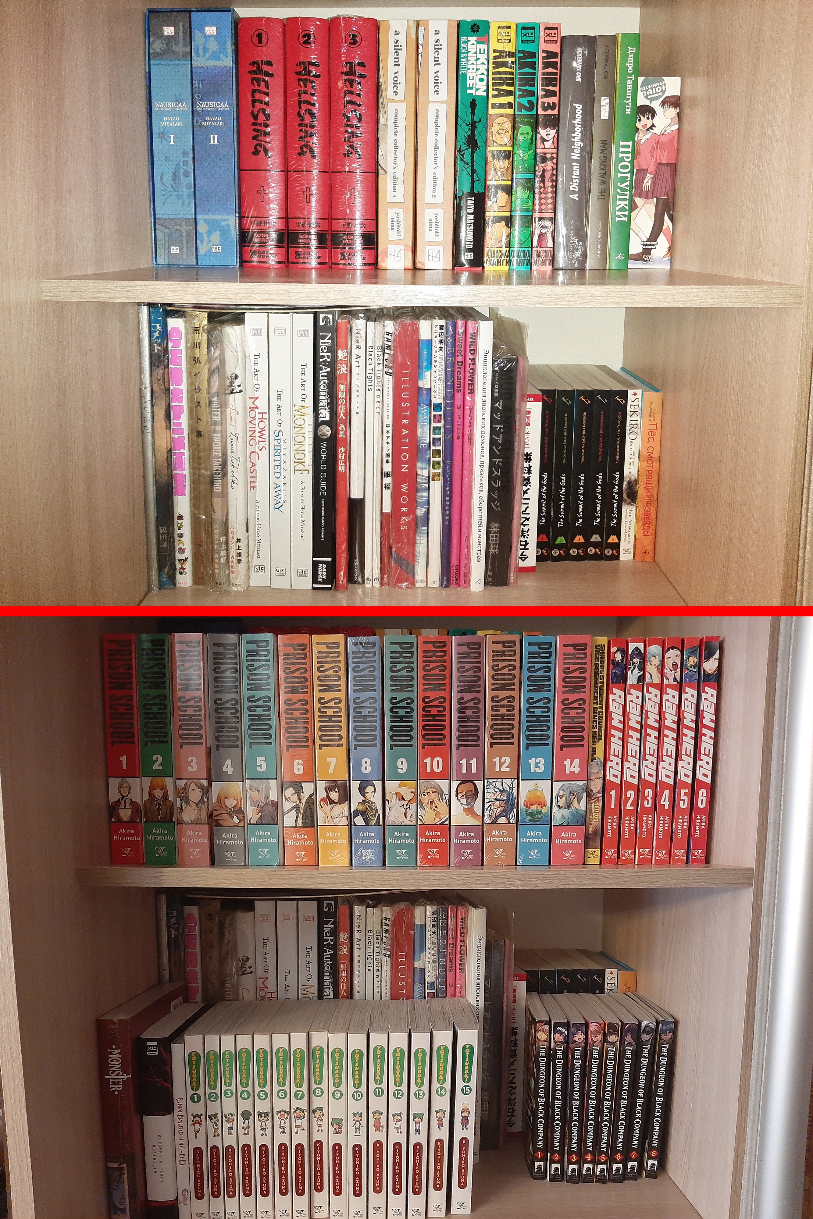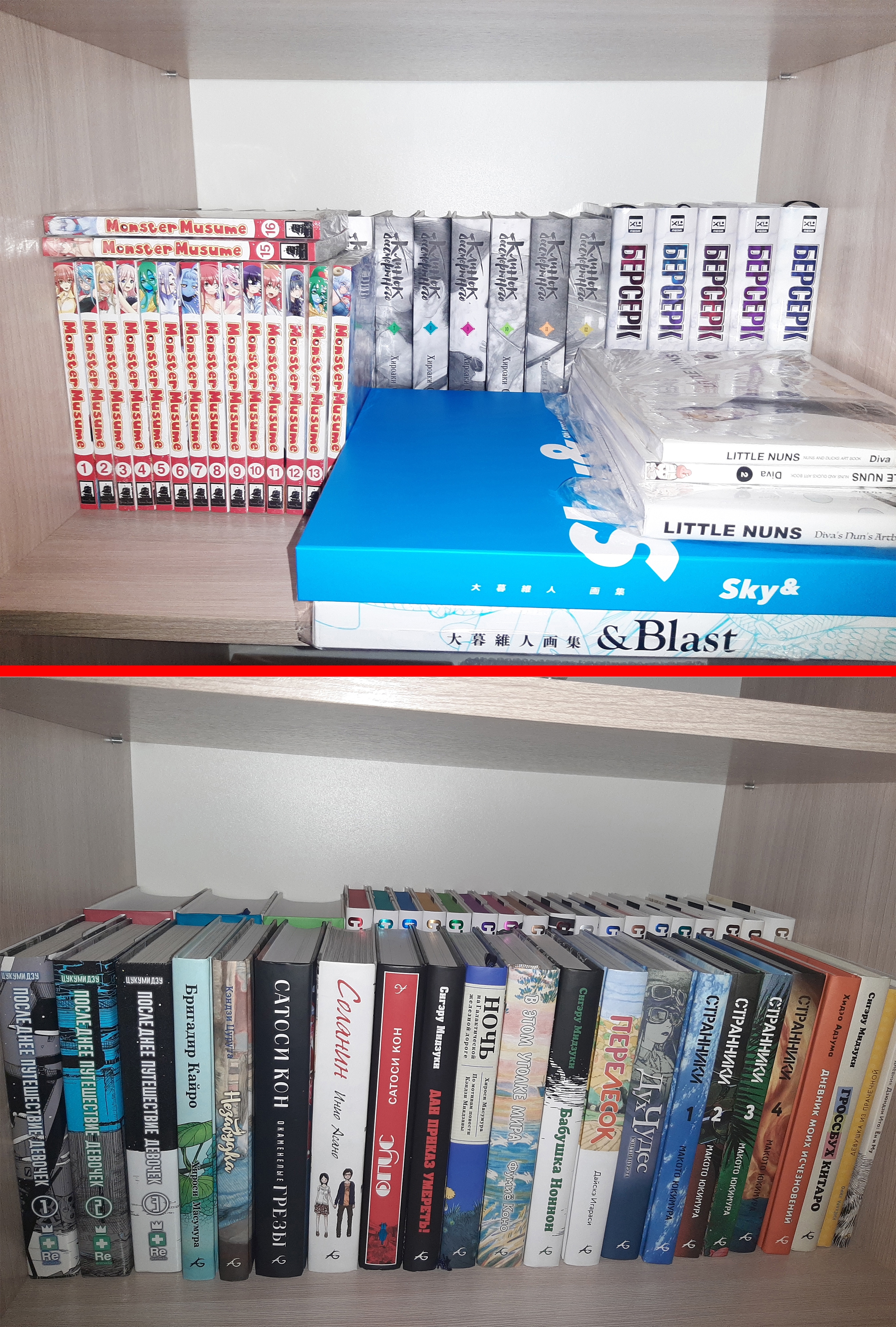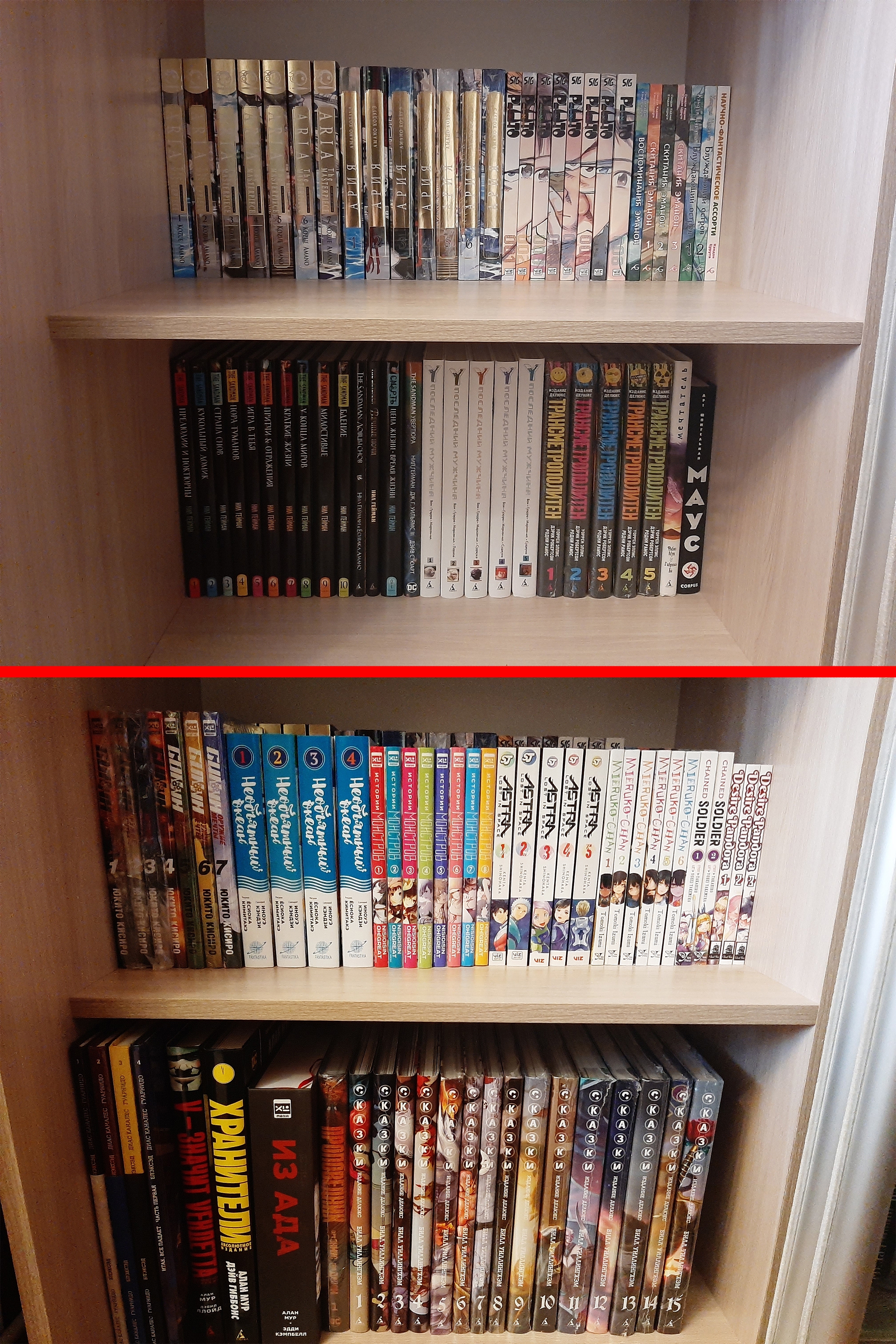 >>2070492 Порядочно времени заняло. Книги в 2 (а где-то и 3) ряда стоят, сверху - задний ряд сфотографировал, снизу - передний. Честенько приходится перестановками заниматься, когда новинки приходят.