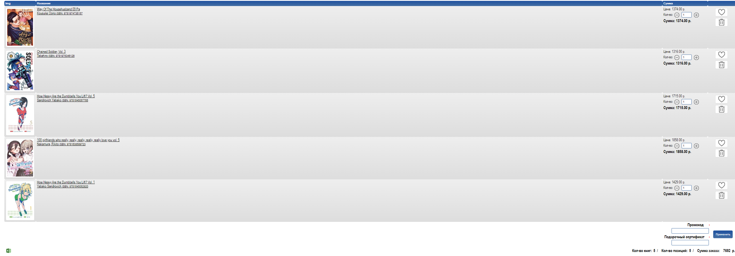 >>2089267 1901 рубль на момент оплаты 22.03 (1.14 кг), за 6 книг ~4000р отдал. подешевле, чем если бы то же самое на логобуке заказывал (1 пик). + 3 том "гантелей", которого у них ща нет в наличии за доставку того, что на втором пике отдал 4061р (3.628 кг)