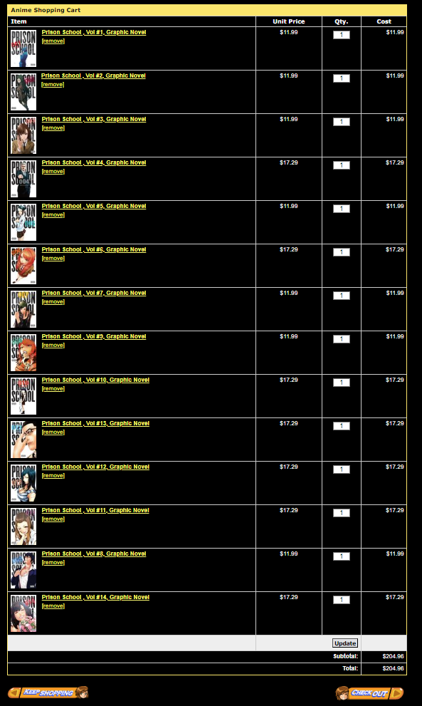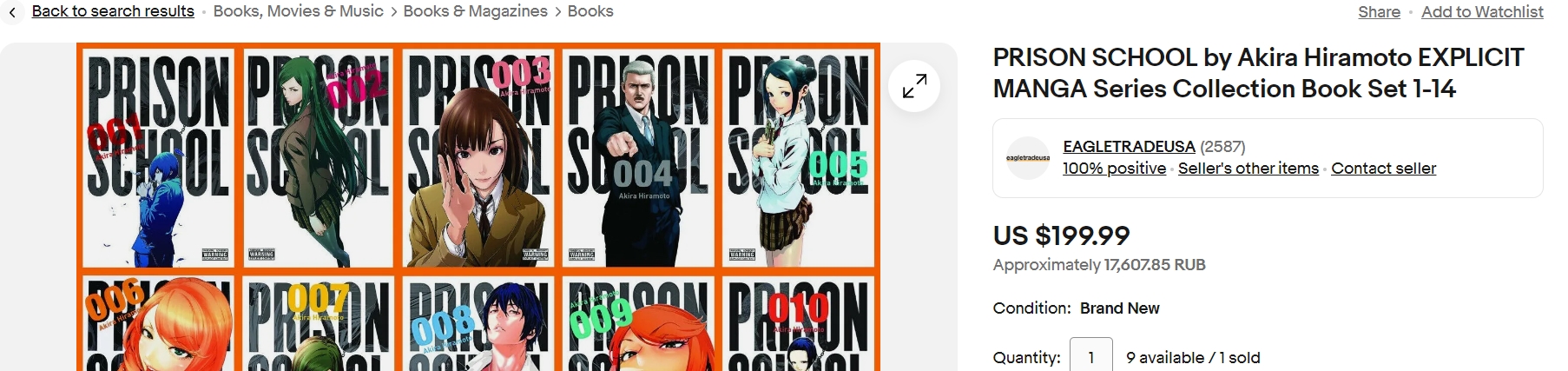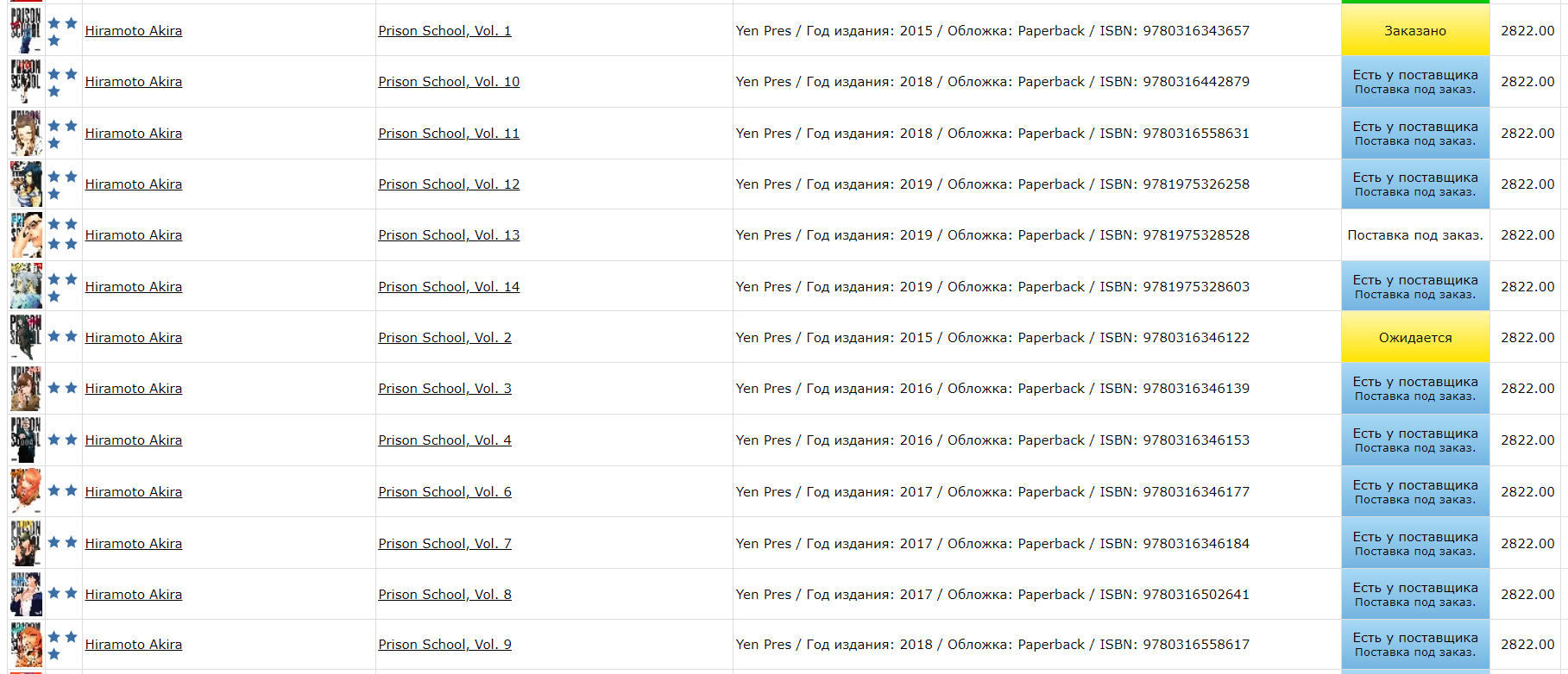 >>2223206 Да нет уже какого-то одного способа, которым выйдет намного дешевле, чем каким-либо другим. Как вариант: найти на ebay полный сет и самому выкупить и отправить через посредника себе, или с помощью посредника и выкупить, если сам не можешь (boxberry помогают с выкупом, но явно не единственные). Давно не проверял, у кого ща дешевле доставка выходит, лучше самому посравнивать. Самый дешевый лот вижу за 200$ (+ мб доставка и комиссия, если посредник выкупает), в основном цена 280+ Можешь в магазине типа animecornerstore купить по-отдельности (2 пик). Тоже где-то 200$ вырисовывается. Про сам выкуп и по вопросам доставки лучше у самих посредников уточнить. Но это из США, мб с Англии можно умудриться как-то подешевле привезти, но че-то не уверен. Стоимость доставки в Россию от веса зависит, можешь найти где-нибудь инфу. Забавно, но книги prison school лёгкие, хоть и двухтомник увеличенный. Бумага, наверное, такая. Если нужно, смогу позже весь сет взвесить. На логобуке ~40к за всё выходит. Если ещё все в наличии будут. На avito ещё какие-то кабанчики поднарядились возить мангу на англюсике. Дороже, чем на логобуке. И ведь покупают, ебануться. Можешь у них поспрашивать, за сколько привезут. Но, в общем-то, они просто сами выкупают и так же через посредников везут.