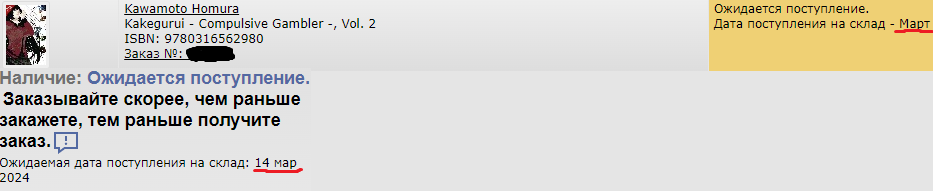 >>2409115 Так и я не рекомендую группы вк как исконно лучший вариант, просто как опцию если готов рискнуть ради потенциальной экономии. А так да, сдэк и ижэ с ними всяко понадёжнее будут, пусть у них и присутствуют различные ограничения на доставку. Самураюшка, например, с конца лета-начала осени начала отказывать в выкупе и доставке любой манги, хоть мало-мальски отдающей нотками порнографии (Т.е манга необязательно порнографическая, но обложку/содержимое можно при желании притянуть), хотя до этого вроде как спокойно выкупали и доставляли.