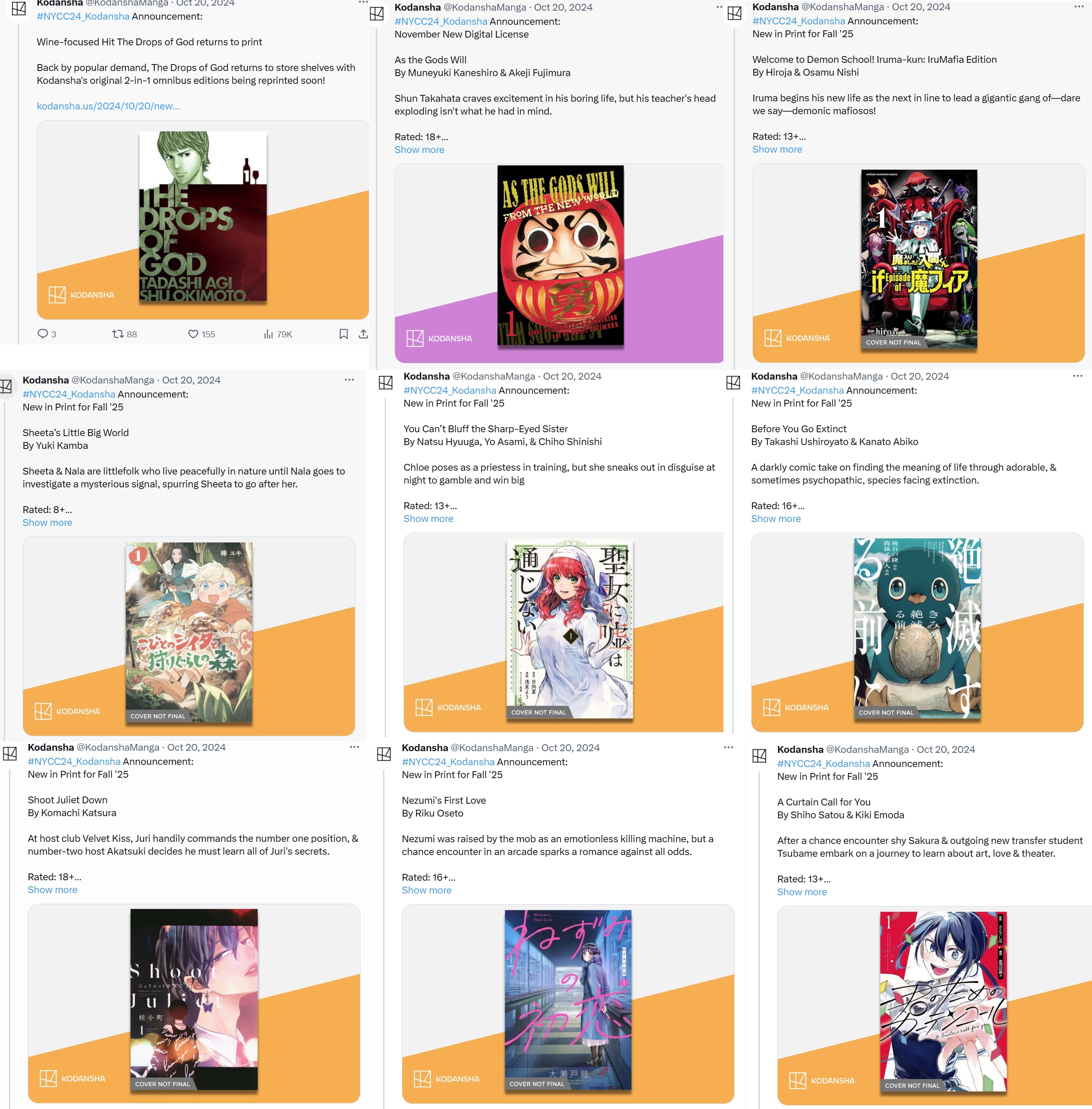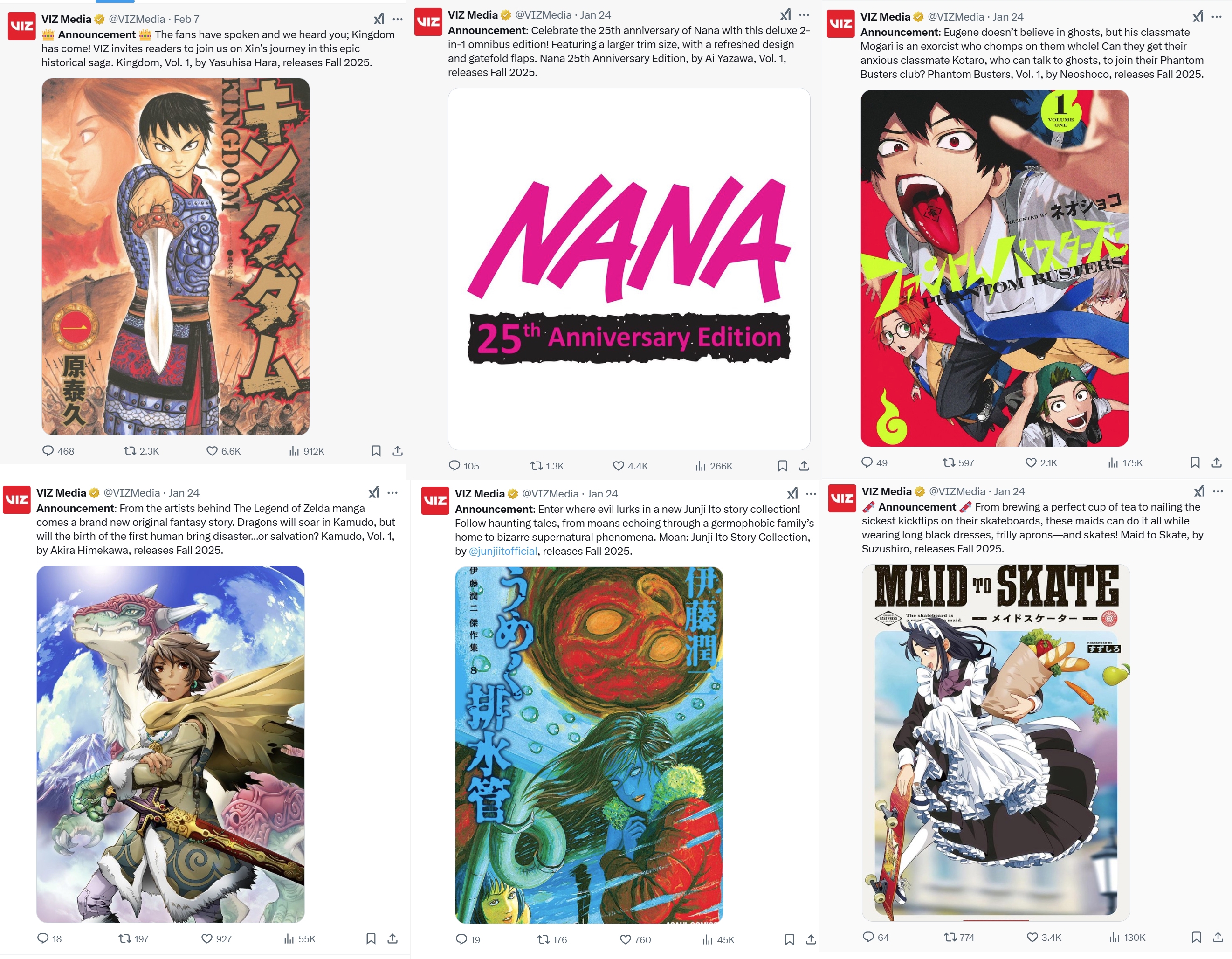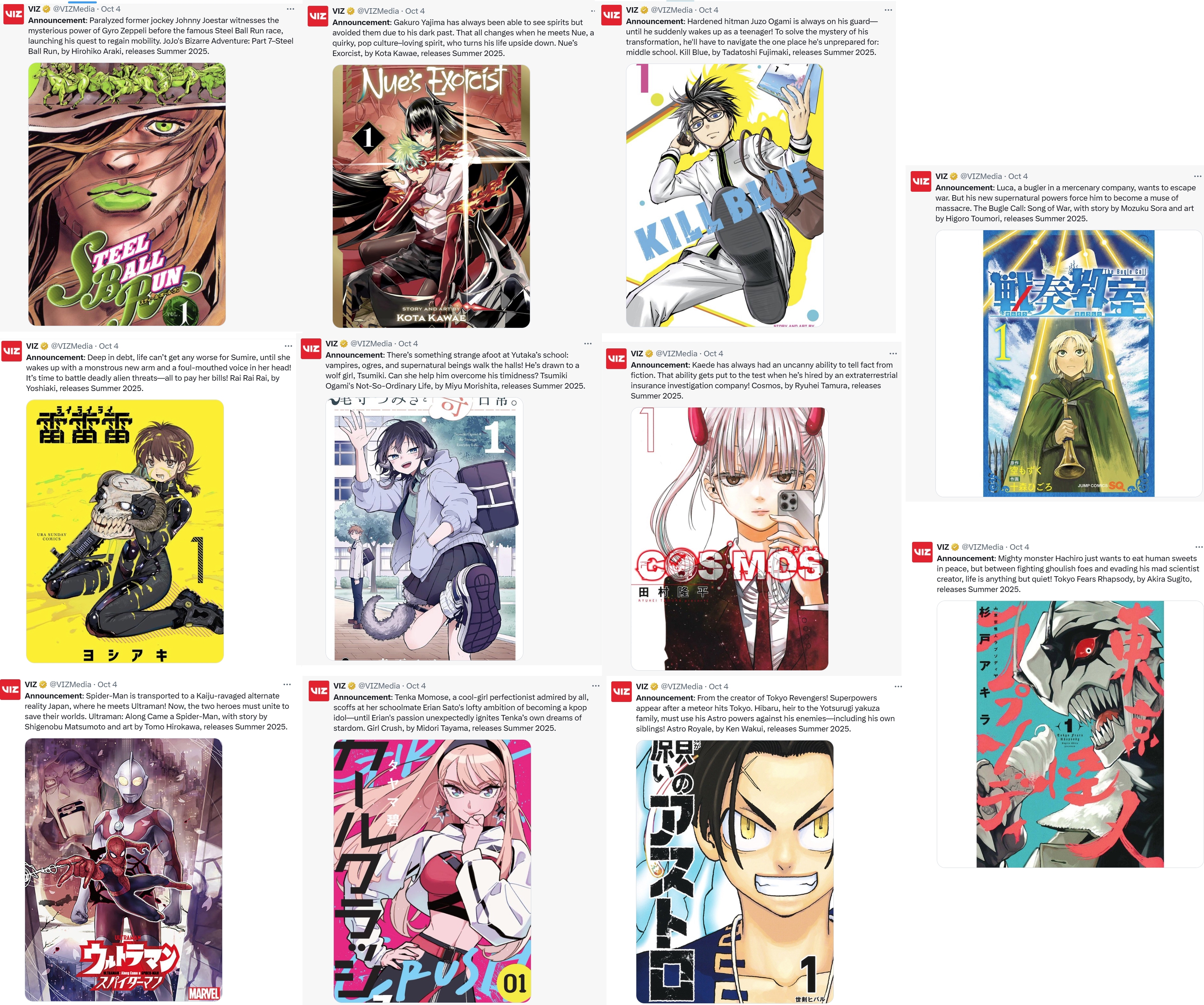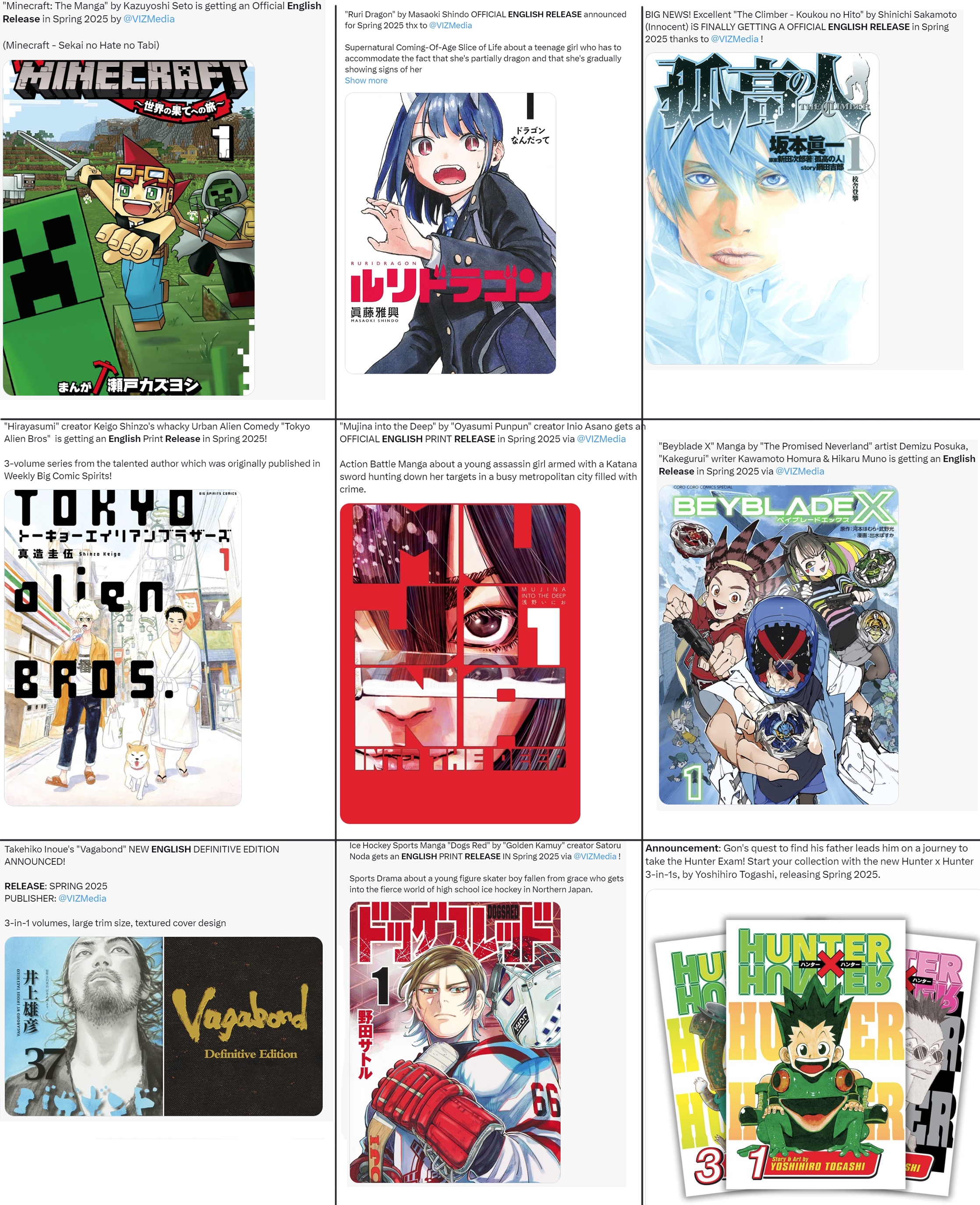 Немного анонсов издательства VIZ: 1 Манга по Minecraft 2 Дракон Рури / Ruri Dragon 3 Скалолаз / Kokou no Hito от Shin-ichi Sakamoto, автора DRCL, Innocent и пр. 4 Братья-пришельцы в Токио / Tokyo Alien Brothers от Keigo Shinzou, автора Hirayasumi 5 Мудзина в глубине / Mujina into the Deep от Inio Asano, автора Oyasumi Punpun и пр. 6 Бейблэйд X / Beyblade X от художницы Yakusoku no Neverland Posuka Demizu и авторов Kakegurui 7 Переиздание Vagabond Definitive Edition 8 Dogsred от Satoru Noda, автора Golden Kamuy 9 Переиздание Hunter x Hunter в формате 3в1