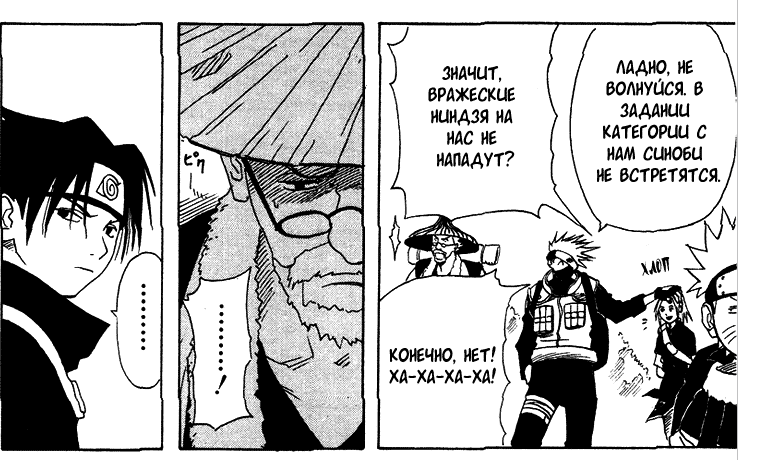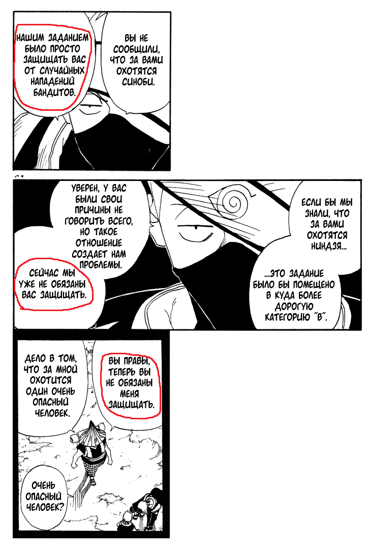>Этого Калкаши не знал, и знать не мог, и тем более заранее. В манге Какаши после стычки с чунинами говорит, что в следующий раз за ними придет джонин. Он понимал все. Да, не знал, что это будет Забуза, но что будет шиноби его ранга - понимал прекрасно.