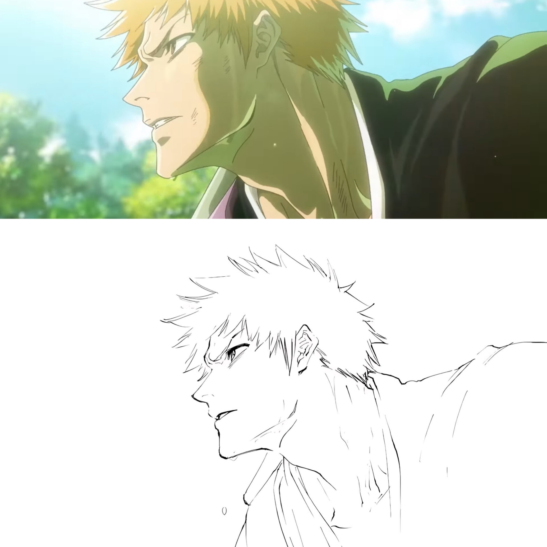 >Я проверяю дизайны персонажей для аниме, и для битвы с Яхве есть листы моделей для каждого уровня травмы Ичиго. Это безумие... Это потому, что я причинил ему так много боли...